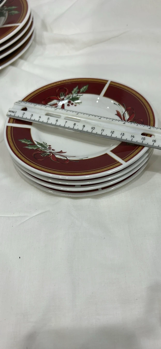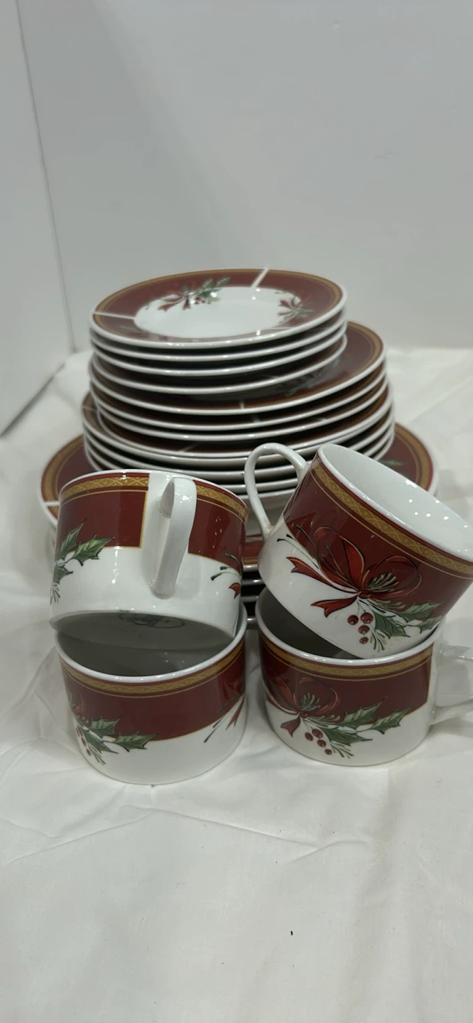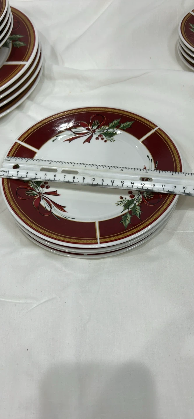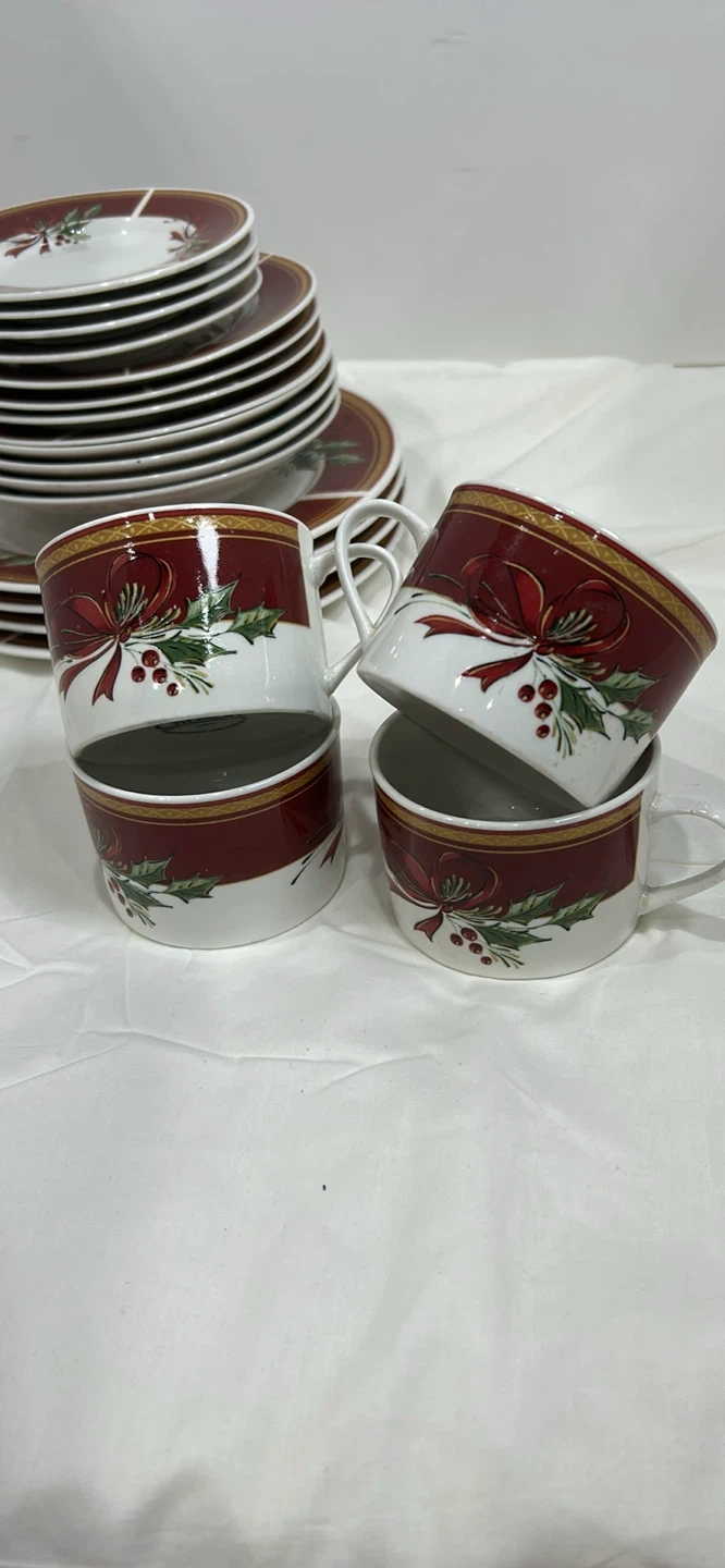 Gibson 20 pieces dinnerware set 4 serving 10.5 inch diameter plates, 4 salad 7.5 inches plates, 4 desserts 6.5 inches in diameter, 4 tea / coffee cups, 4 soup plates, dishwasher, microwave and oven safe. This festive ceramic dinnerware set features a charming holly, berry, and ribbon design on a white background with a burgundy rim. Adds a touch of holiday cheer to any table setting! Ceramic.