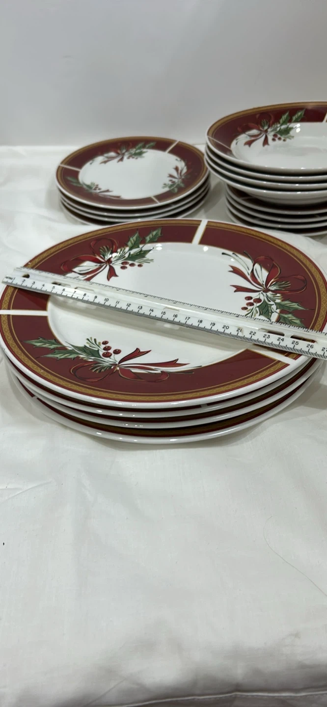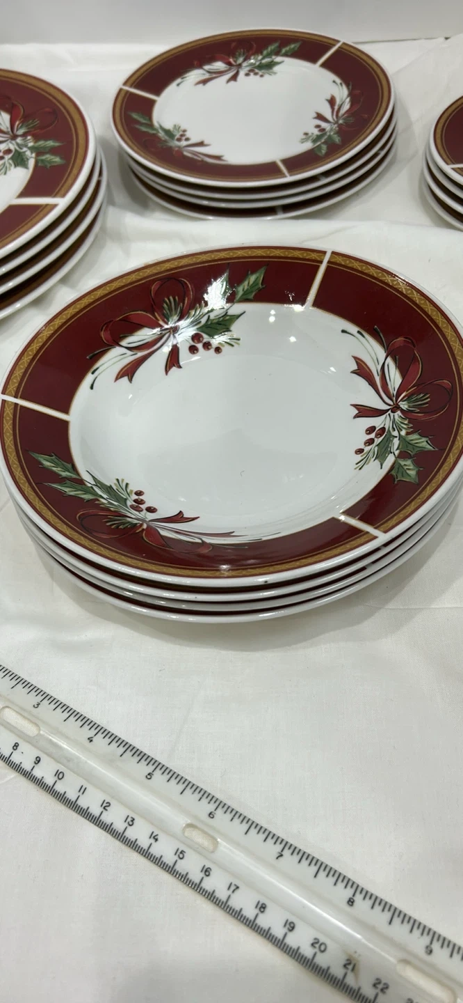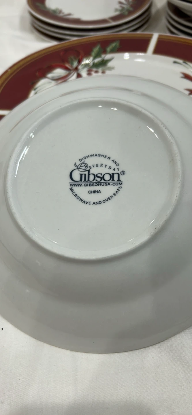 Gibson 20 pieces dinnerware set 4 serving 10.5 inch diameter plates, 4 salad 7.5 inches plates, 4 desserts 6.5 inches in diameter, 4 tea / coffee cups, 4 soup plates, dishwasher, microwave and oven safe. This festive ceramic dinnerware set features a charming holly, berry, and ribbon design on a white background with a burgundy rim. Adds a touch of holiday cheer to any table setting! Ceramic.