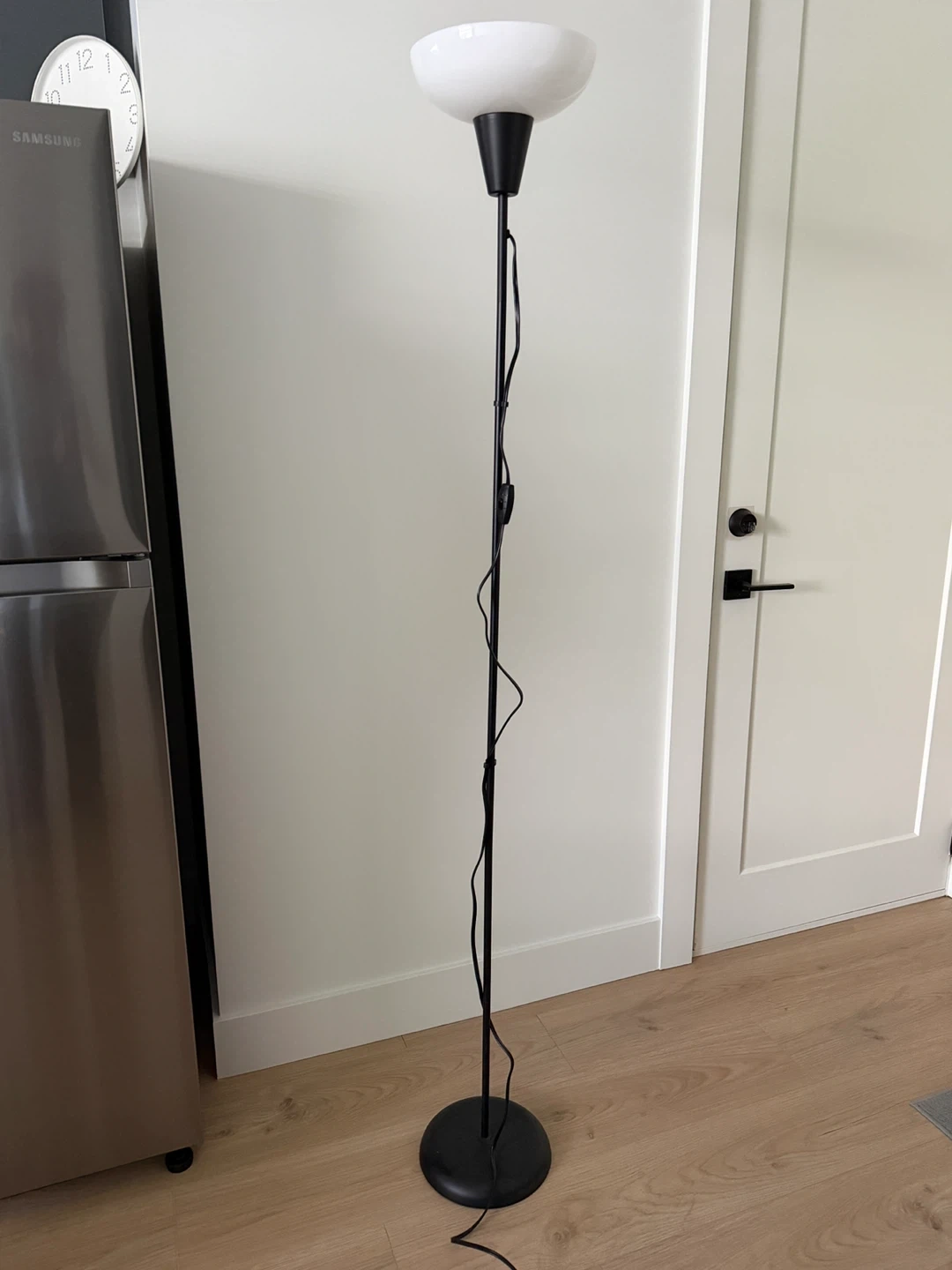 This black floor lamp from IKEA has a simple, modern design. It's perfect for providing ambient lighting in any room. The lamp stands tall and has a circular base.Used only for a few months.