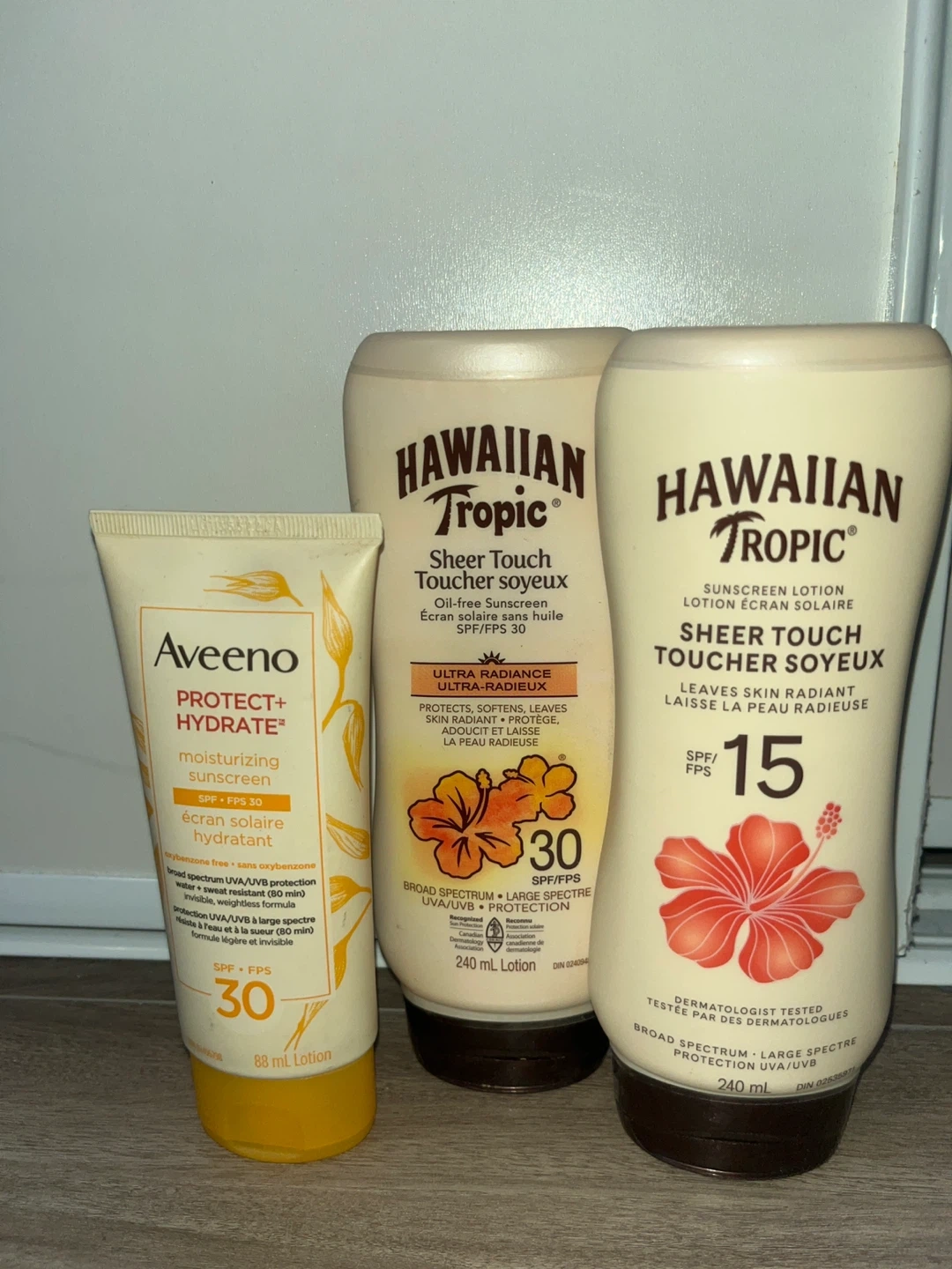 Three sunscreen lotions are available. One Aveeno Protect + Hydrate moisturizing sunscreen SPF 30 in an 88 ml bottle. Two Hawaiian Tropic Sheer Touch lotions, one SPF 15 and one SPF 30, both in 240 ml bottles. Leaves skin radiant and protected.
