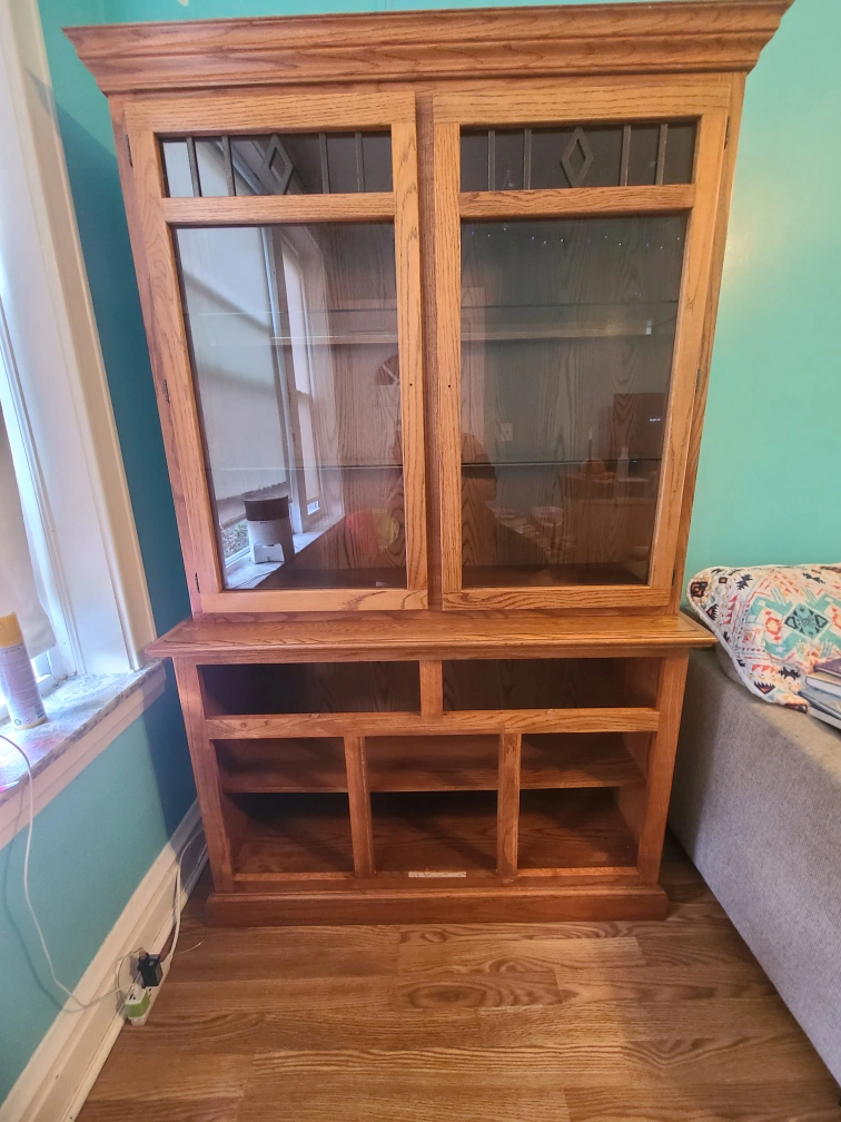I'm giving away a wooden display cabinet. It has a glass door display area on top and shelving on the bottom. Perfect for displaying your favorite items!