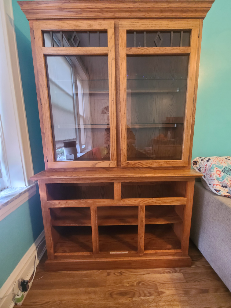 I'm giving away a wooden display cabinet. It has a glass door display area on top and shelving on the bottom. Perfect for displaying your favorite items!