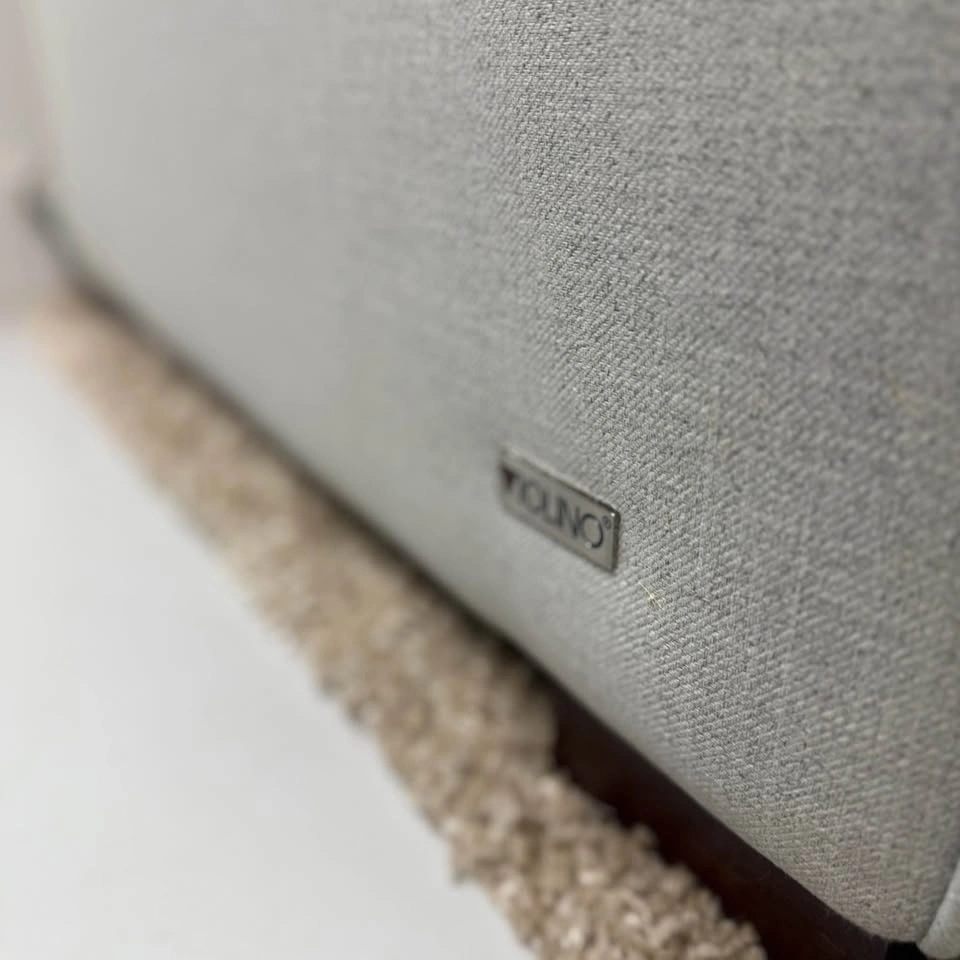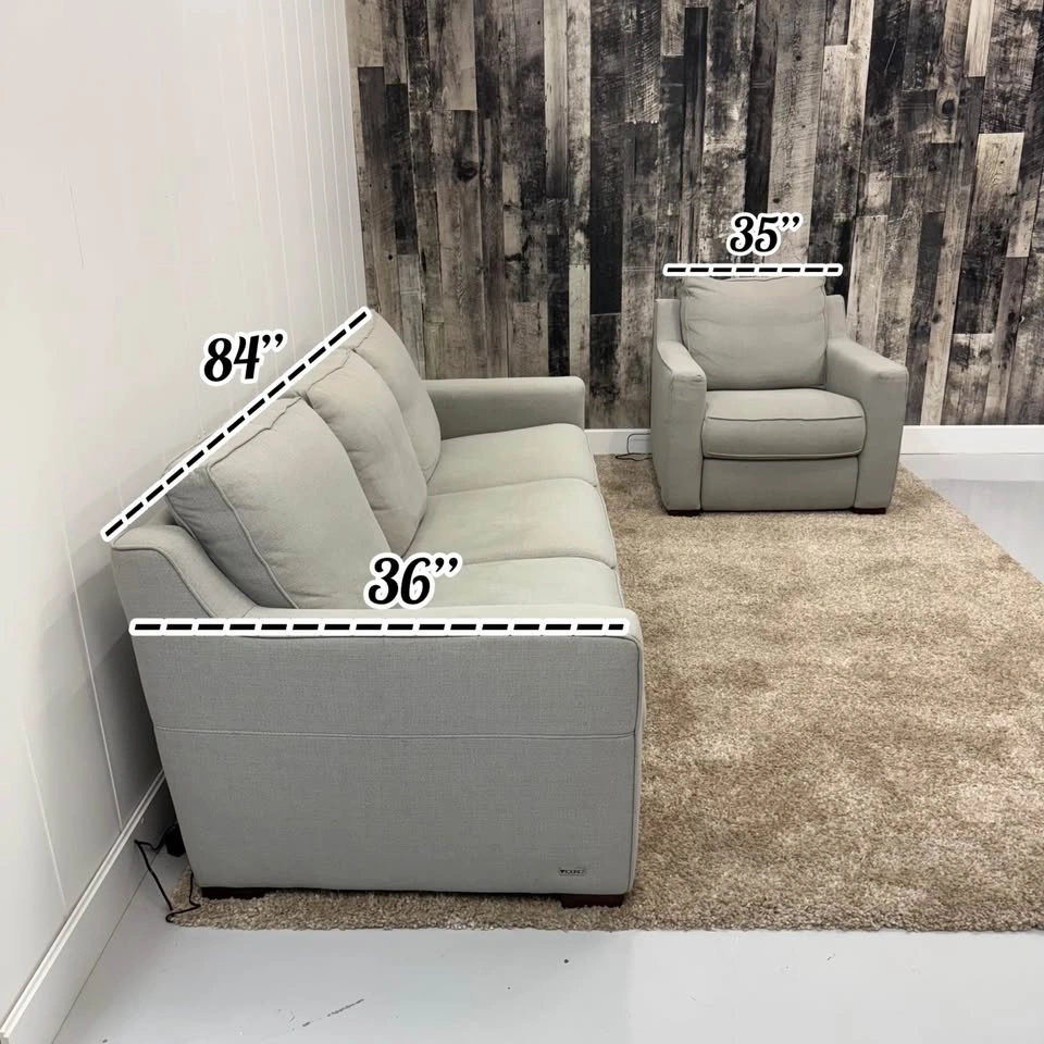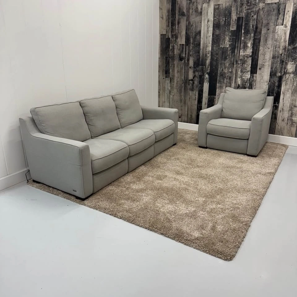 Genuine Violino power motion set. Electric reclining sofa and matching chair with a clean track arm design in a soft woven fabric in a light neutral tone. Professionally steam cleaned with fabric shampoo and enzyme treatment. This sofa and chair set came from a non-smoking home with no stains, rips, or tears. Let me know if you're interested!