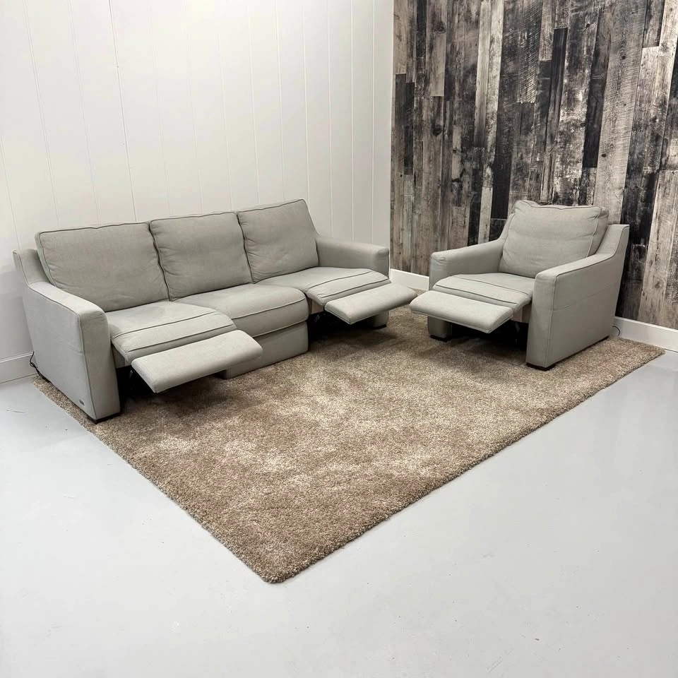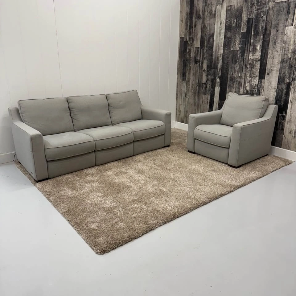 Genuine Violino power motion set. Electric reclining sofa and matching chair with a clean track arm design in a soft woven fabric in a light neutral tone. Professionally steam cleaned with fabric shampoo and enzyme treatment. This sofa and chair set came from a non-smoking home with no stains, rips, or tears. Let me know if you're interested!