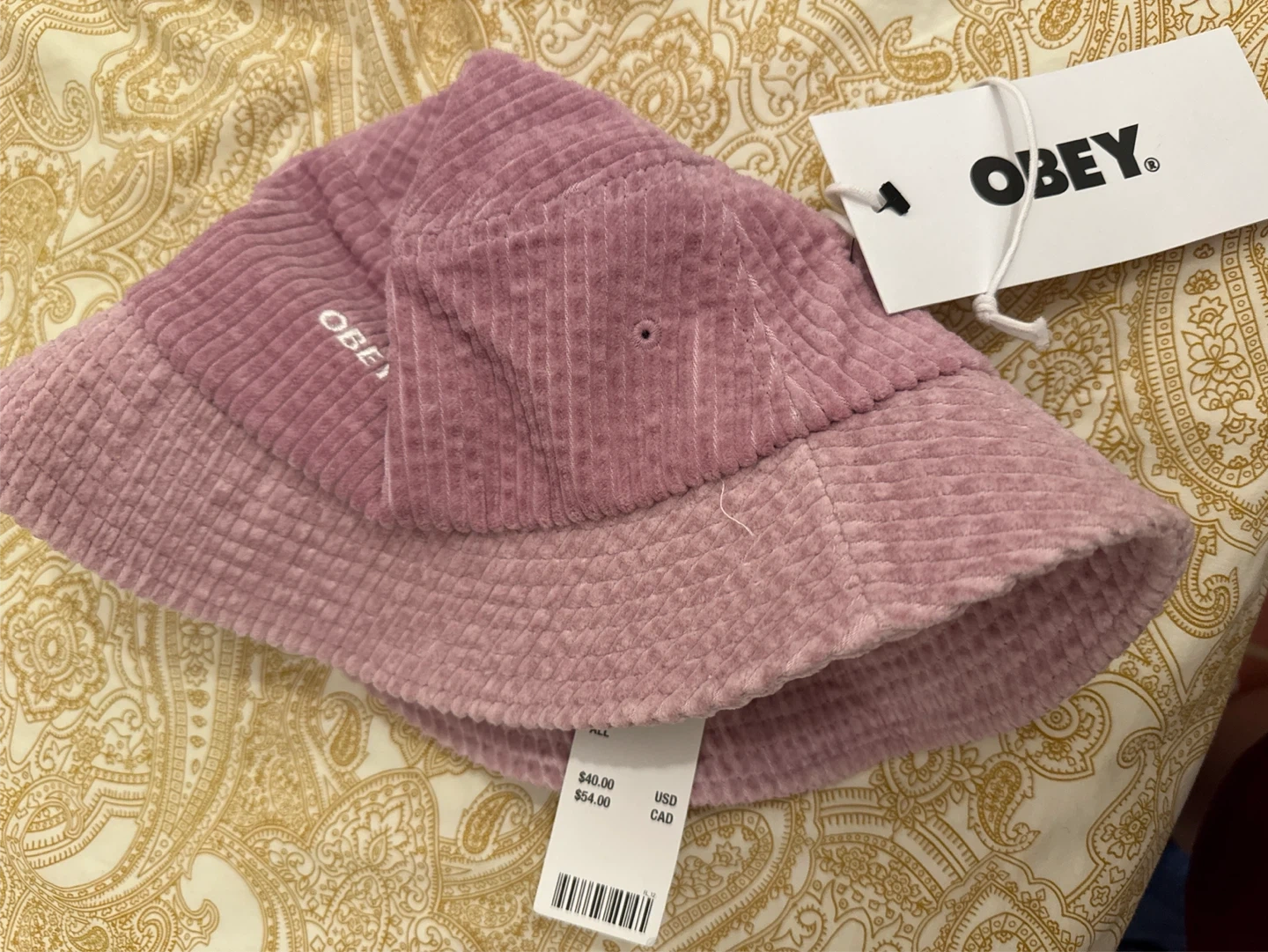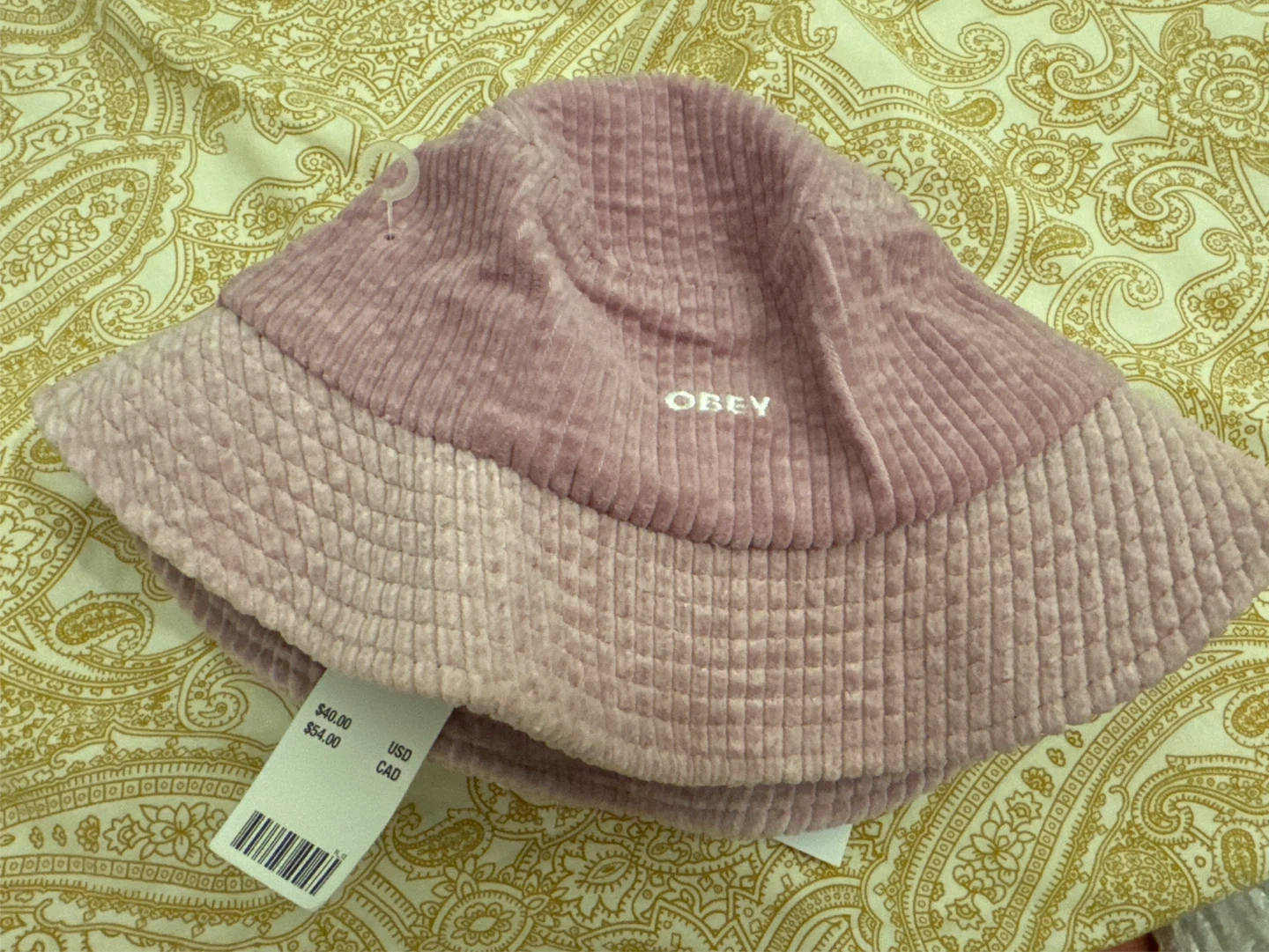 This Obey bucket hat is made of soft pink corduroy. It features the Obey logo embroidered on the front. A stylish accessory for any outfit!
