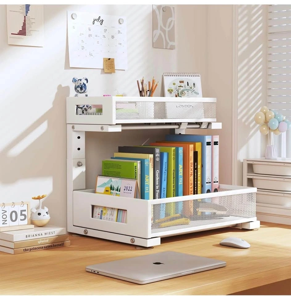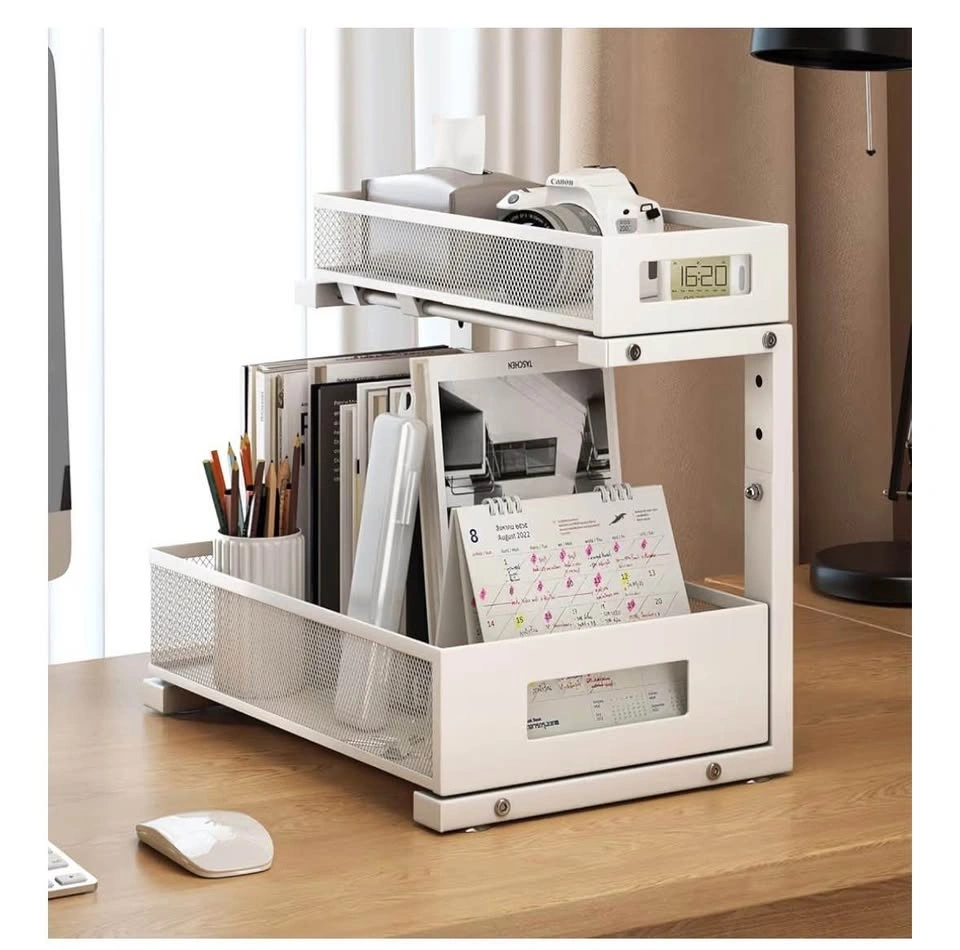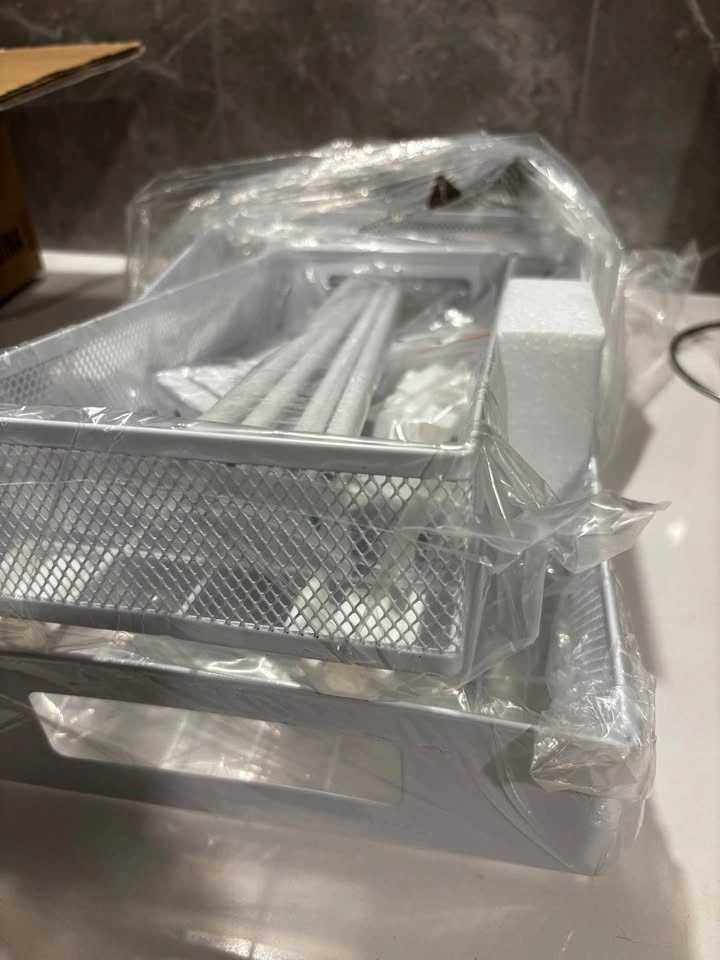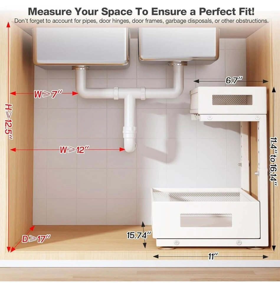 Brand new Biboraya Large 2-Tier Elegant Mesh Pull Out Shelf for Kitchen and Bathroom Cabinet Organization. Features a bottom basket size of 15.8" x 10" and a top basket size of 15.8" x 6.5". The double-layer pull-out design allows easy access to items. L-shaped design and 5-level adjustable height optimize under-sink storage. Material is carbon steel.