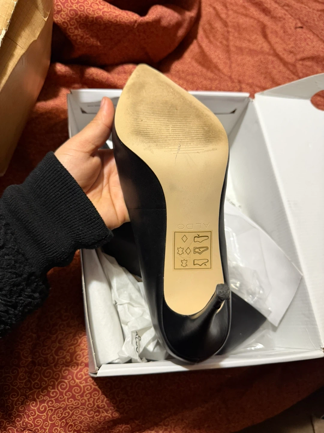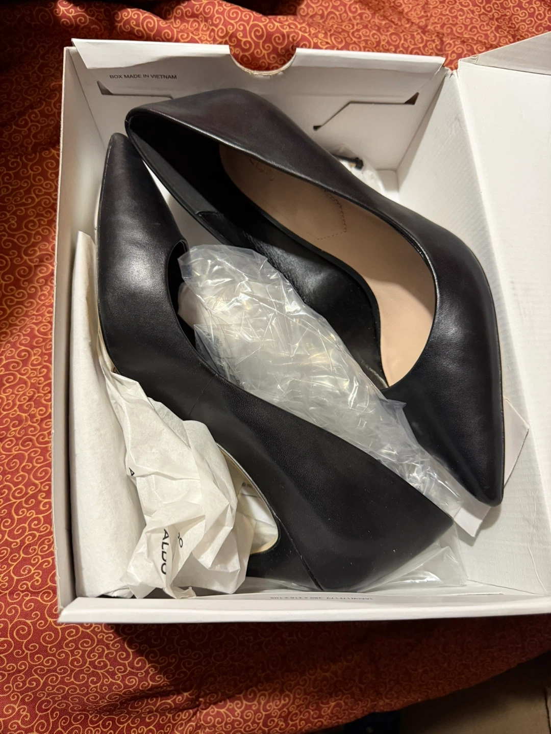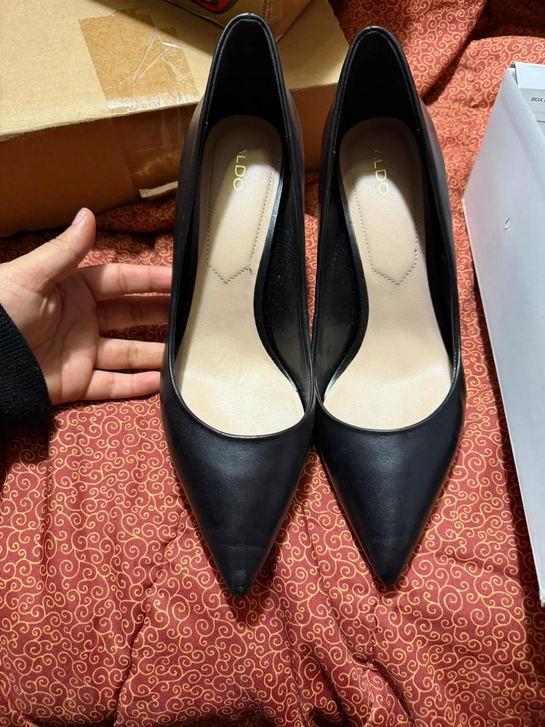 Classic black leather stiletto heel pumps by ALDO. These elegant heels feature a pointed toe and a sleek silhouette. Perfect for dressing up any outfit!