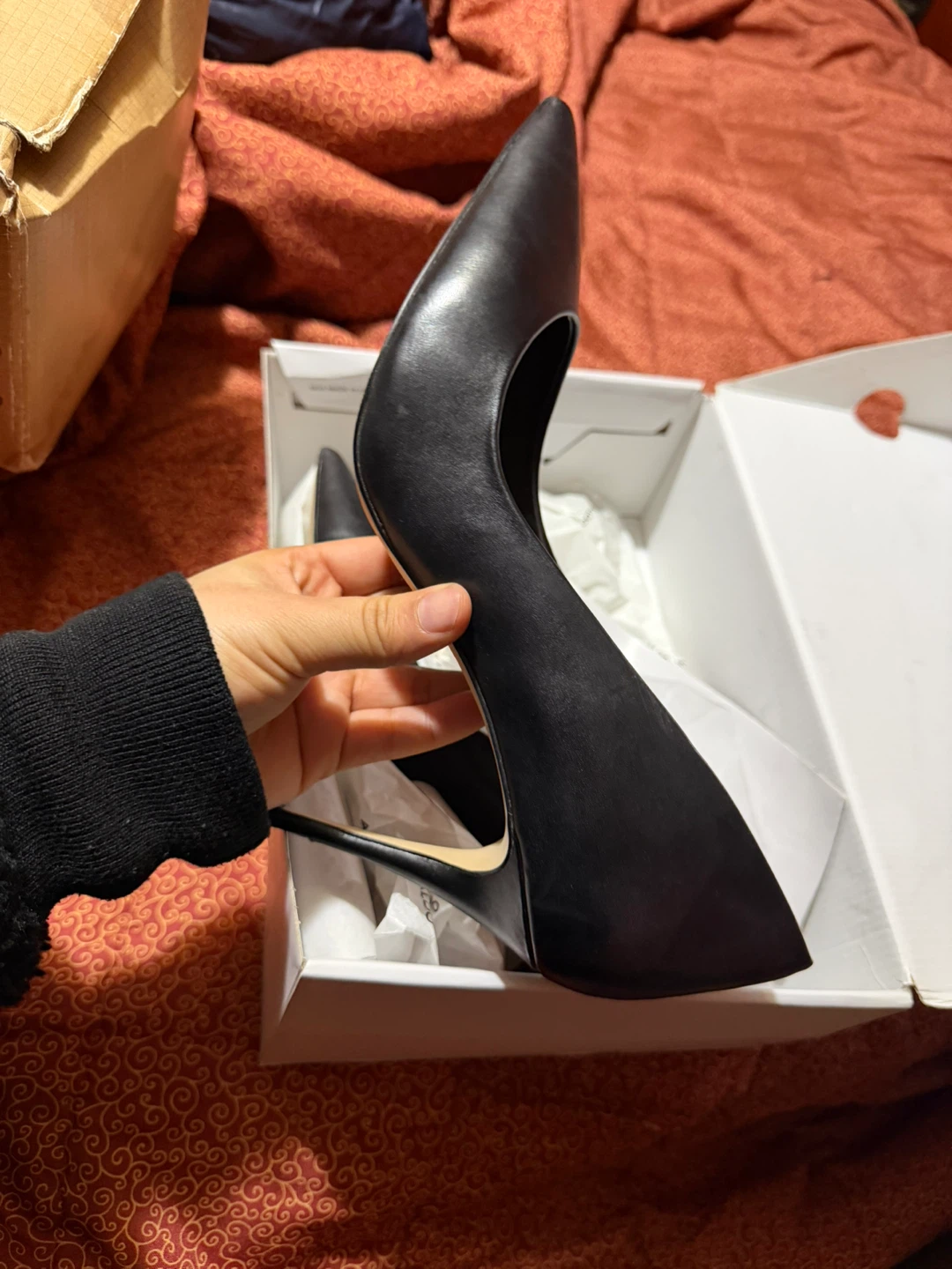 Classic black leather stiletto heel pumps by ALDO. These elegant heels feature a pointed toe and a sleek silhouette. Perfect for dressing up any outfit!
