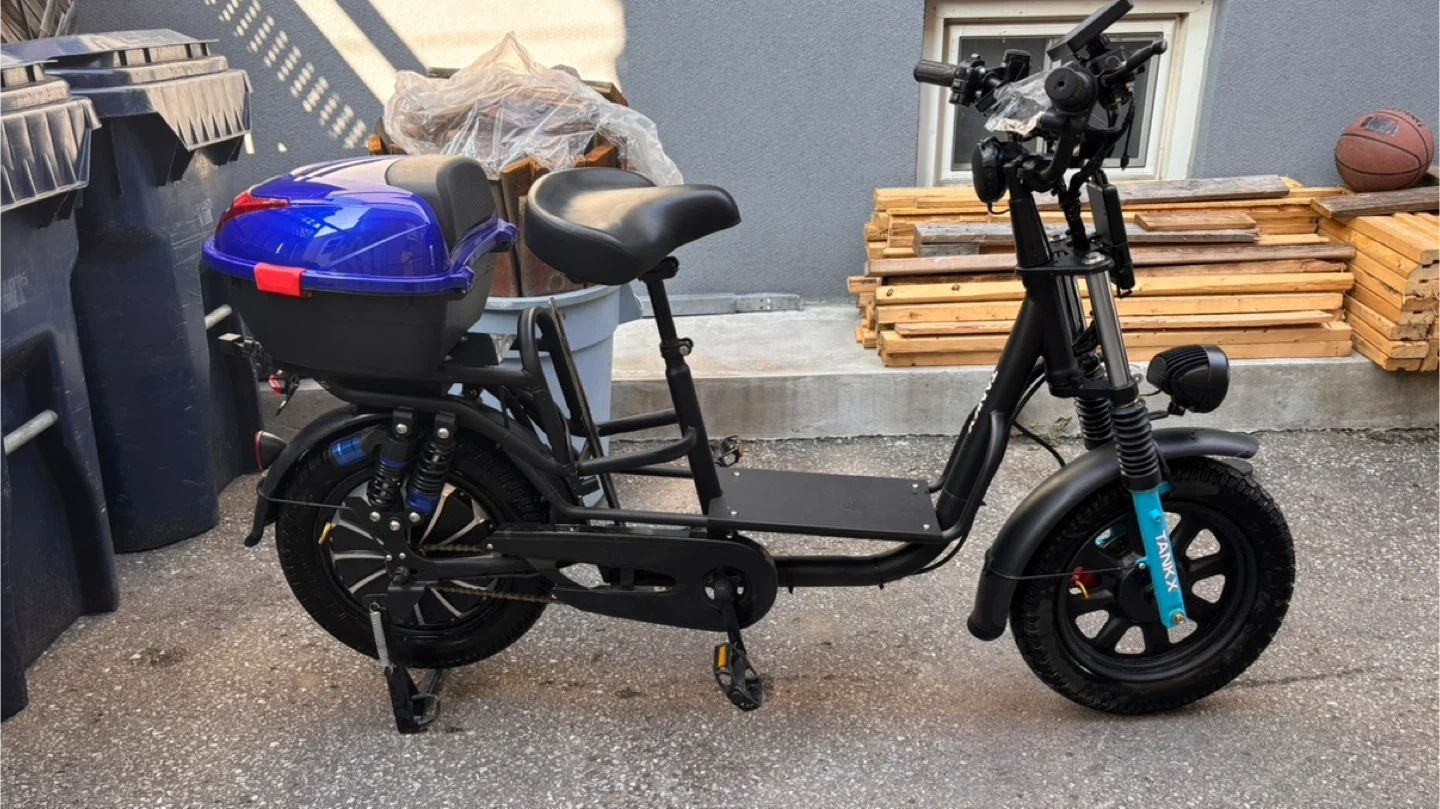 This is a black electric scooter with a bright blue storage box. It features a comfortable seat and a sturdy frame. Perfect for getting around town quickly!