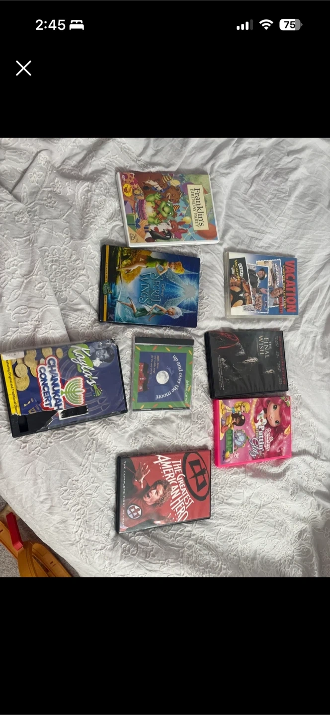 This lot includes several DVDs: Franklin's Birthday Party, Disney's Secret Wings, Vacation Collection, The Final Wish, Strawberry Shortcake's Puttin' on the Glitz, Kayla's Chanukah Concert, The Greatest American Hero: The Complete First Season, and Debbie Carroll's Up and Over the Moon. Pick up cash only