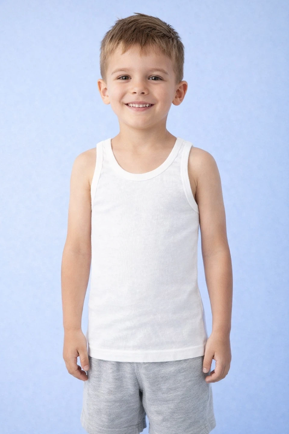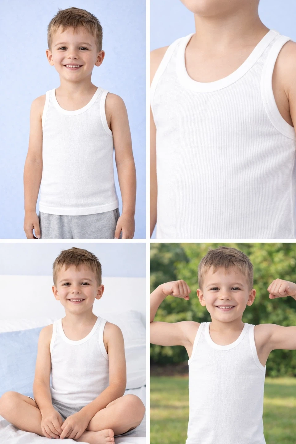 This pack includes three white, ribbed tank tops for boys. They're made from a soft cotton blend for comfort. Perfect for layering or wearing on their own!