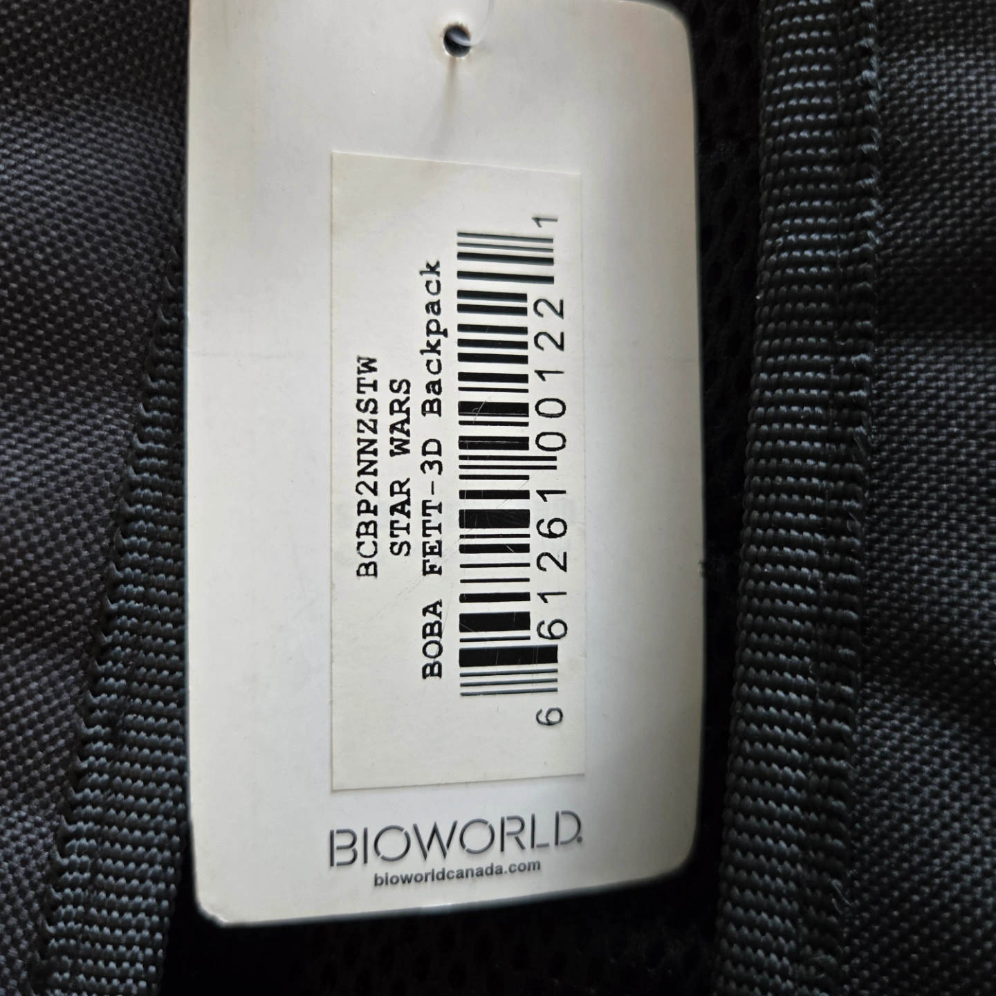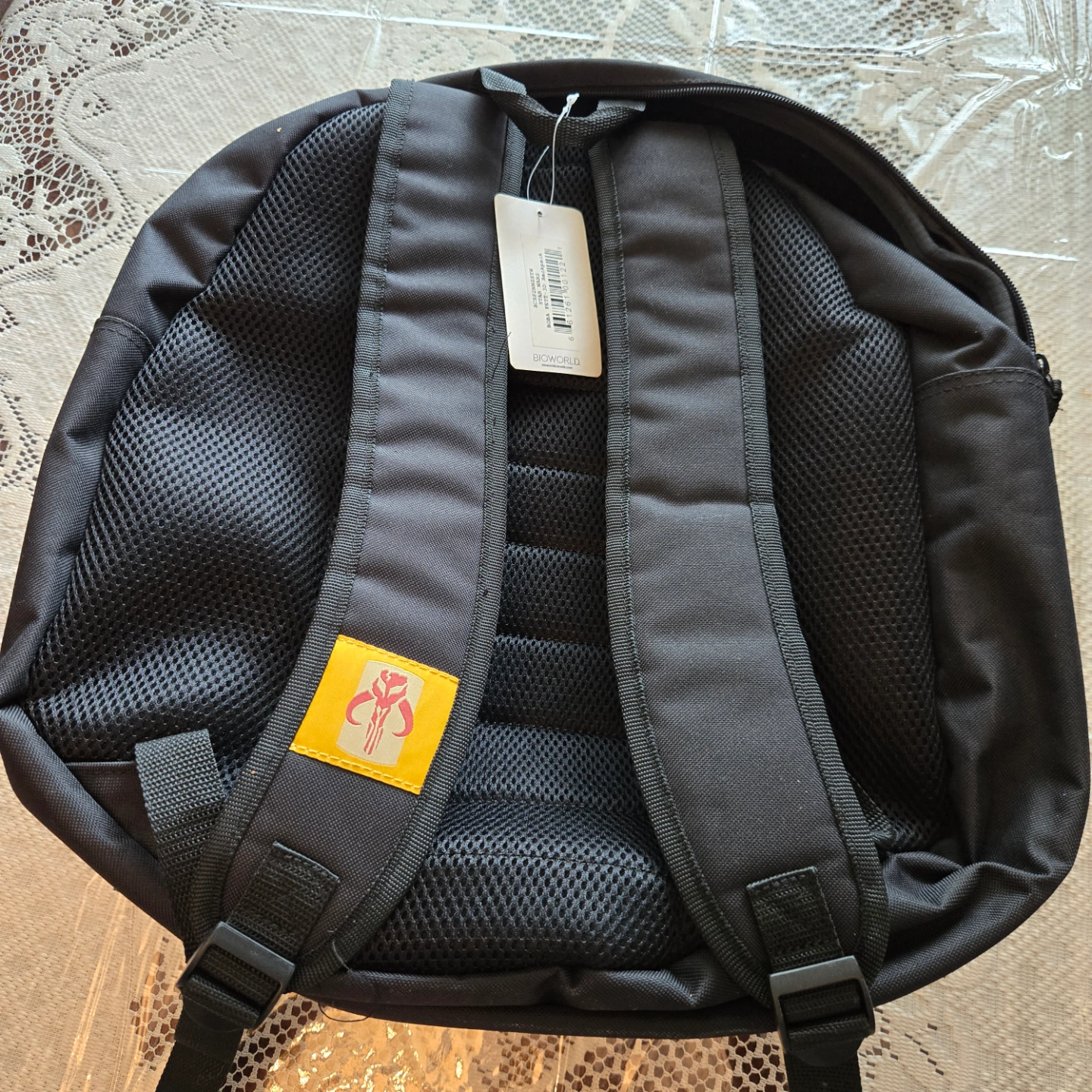 Bioworld Star Wars backpack. Features Boba Fett helmet design. Black with yellow accents. One main compartment. Small interior pocket.