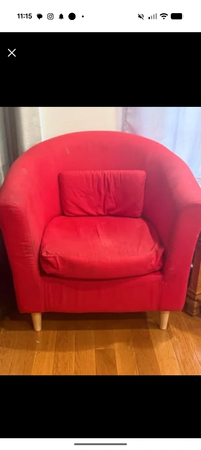 Comfy red accent chair. Upholstered in a soft fabric and comes with a matching cushion. Perfect for adding a pop of colour to any room! It's a great chair for reading or relaxing.