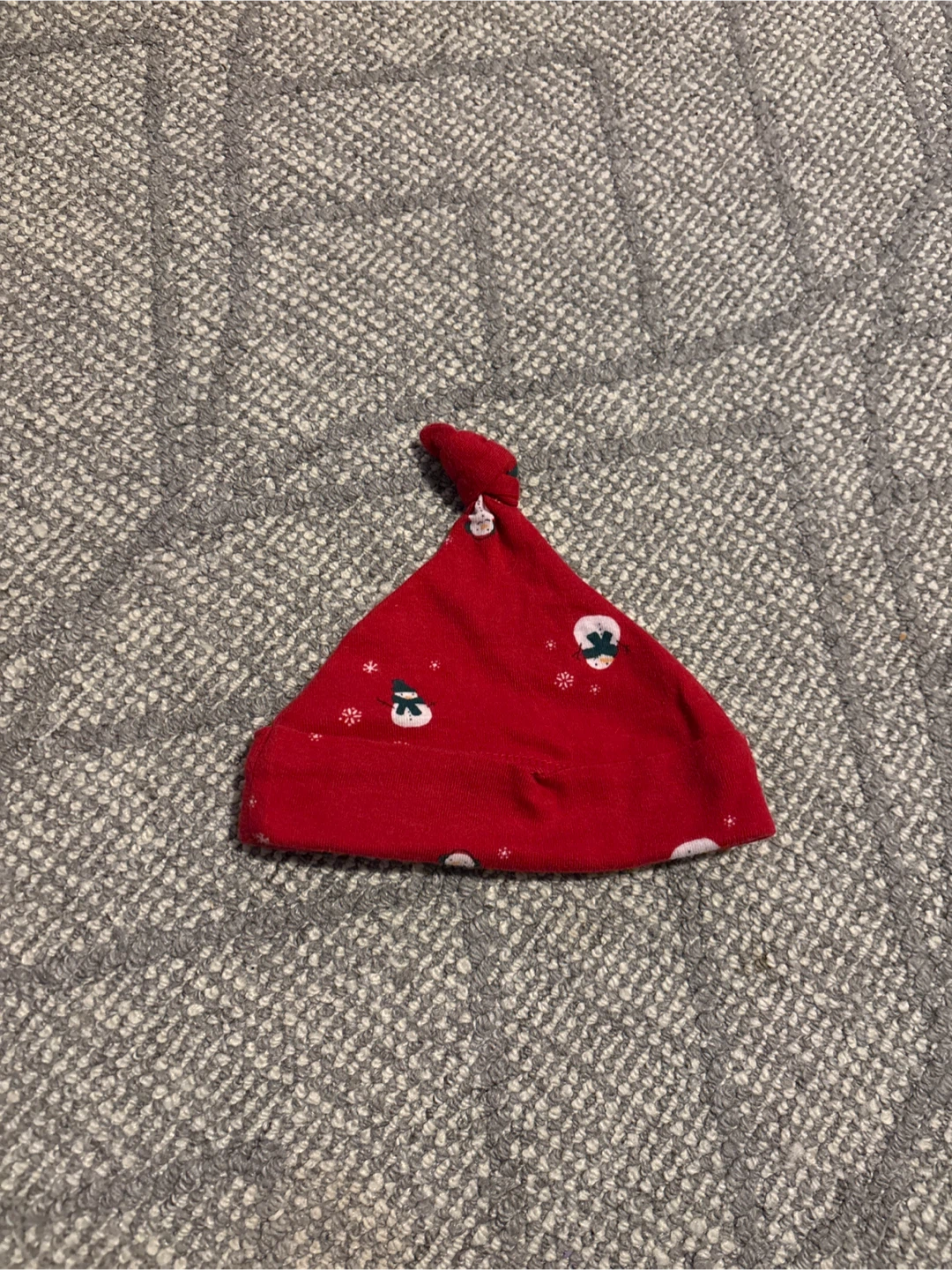 Cute red baby hat with an all-over snowman print. It's made of soft fabric and has a knot at the top. Perfect for keeping little heads warm during the winter months!
