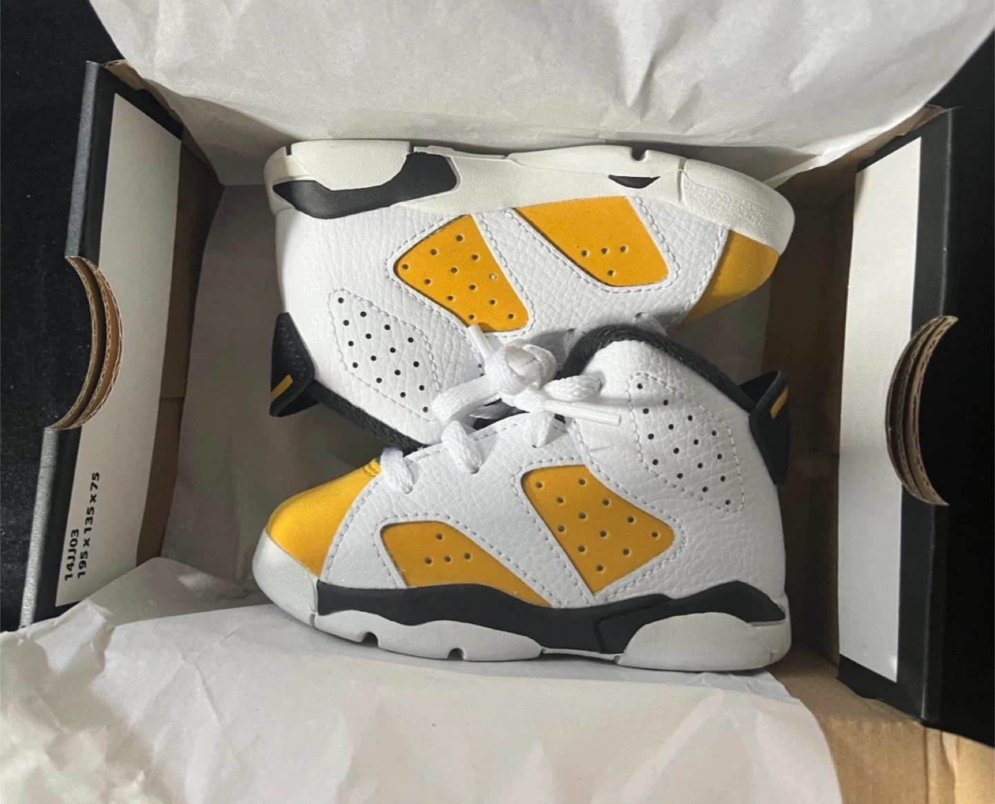 Selling a pair of Jordan 6 toddler shoes in size 5c. They are in excellent condition and come with the original box. The shoes feature a white and yellow color scheme, perfect for your little one!