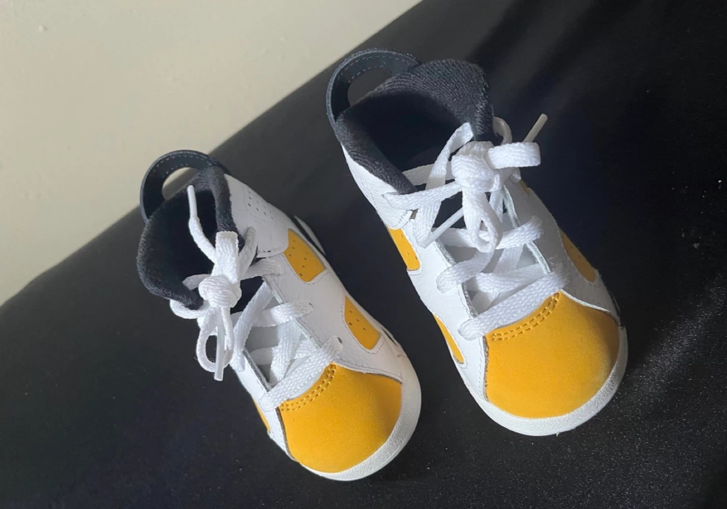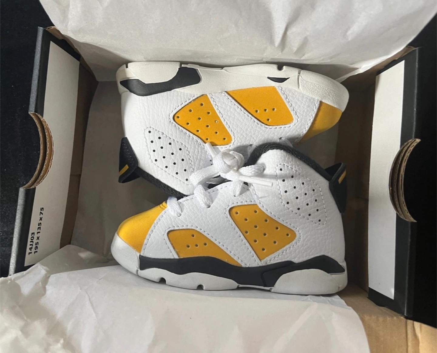 Selling a pair of Jordan 6 toddler shoes in size 5c. They are in excellent condition and come with the original box. The shoes feature a white and yellow color scheme, perfect for your little one!