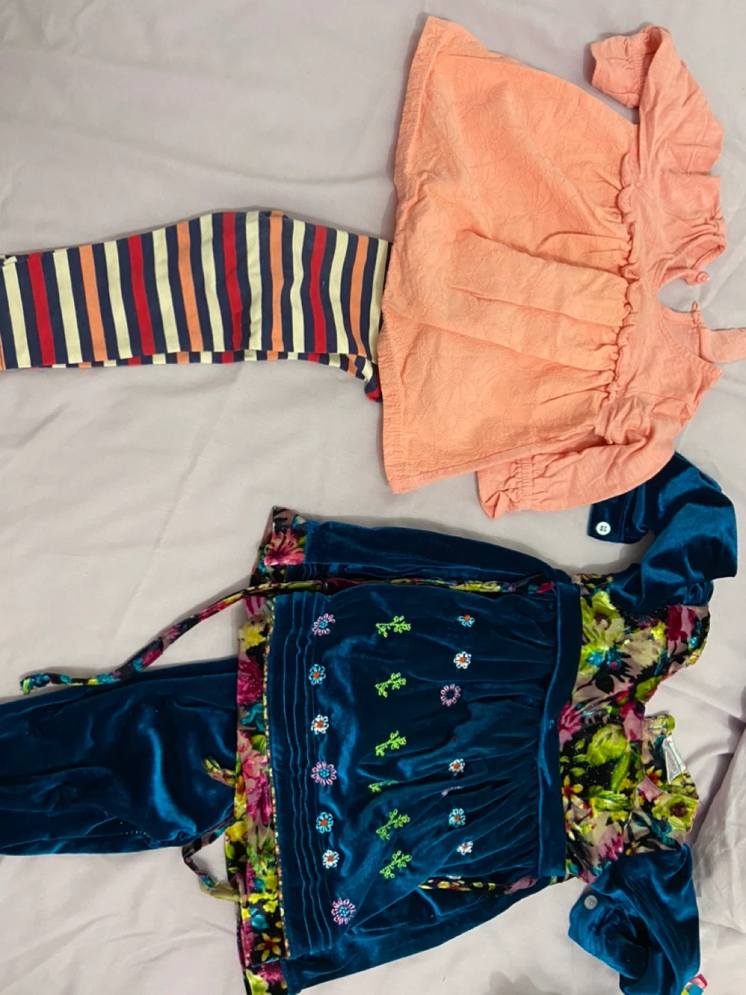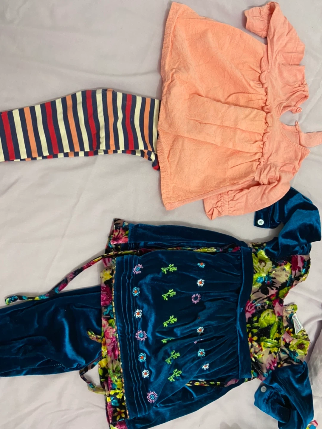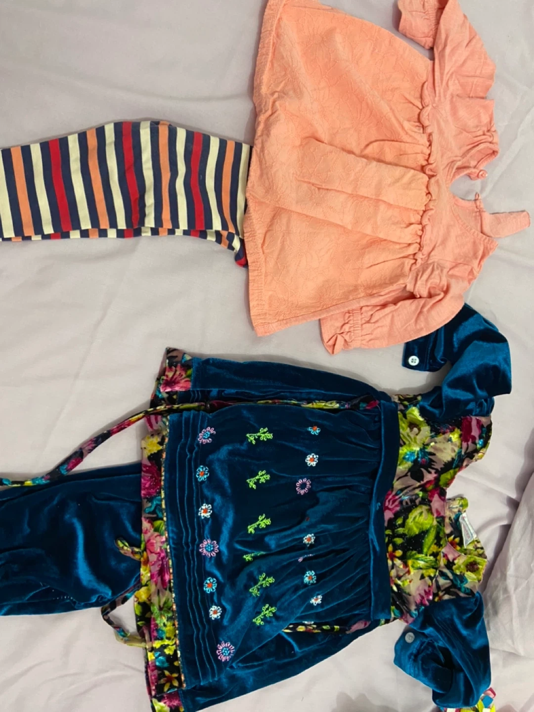 Wore fed Selling a bundle of adorable kids' clothing! Includes a cute peach dress and a pair of colourful striped pants. Also includes a blue velvet outfit with floral detailing. Perfect for your little one!