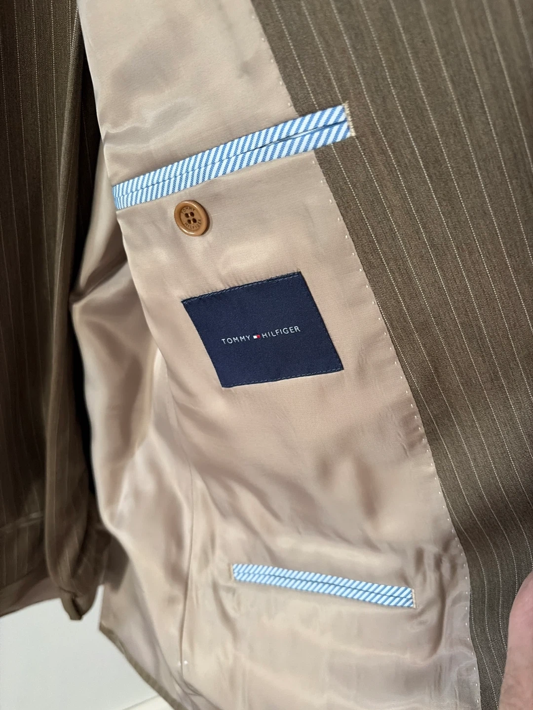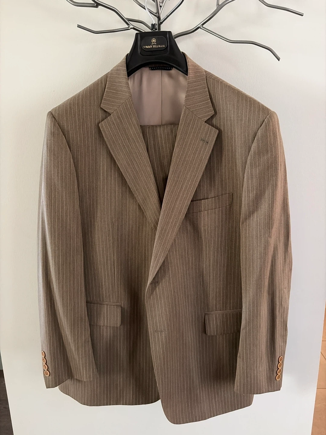 This is a Tommy Hilfiger pinstripe suit jacket and pants. The suit is brown with thin white pinstripes. It features a classic notched lapel and button closure. The interior lining is a light tan satin.