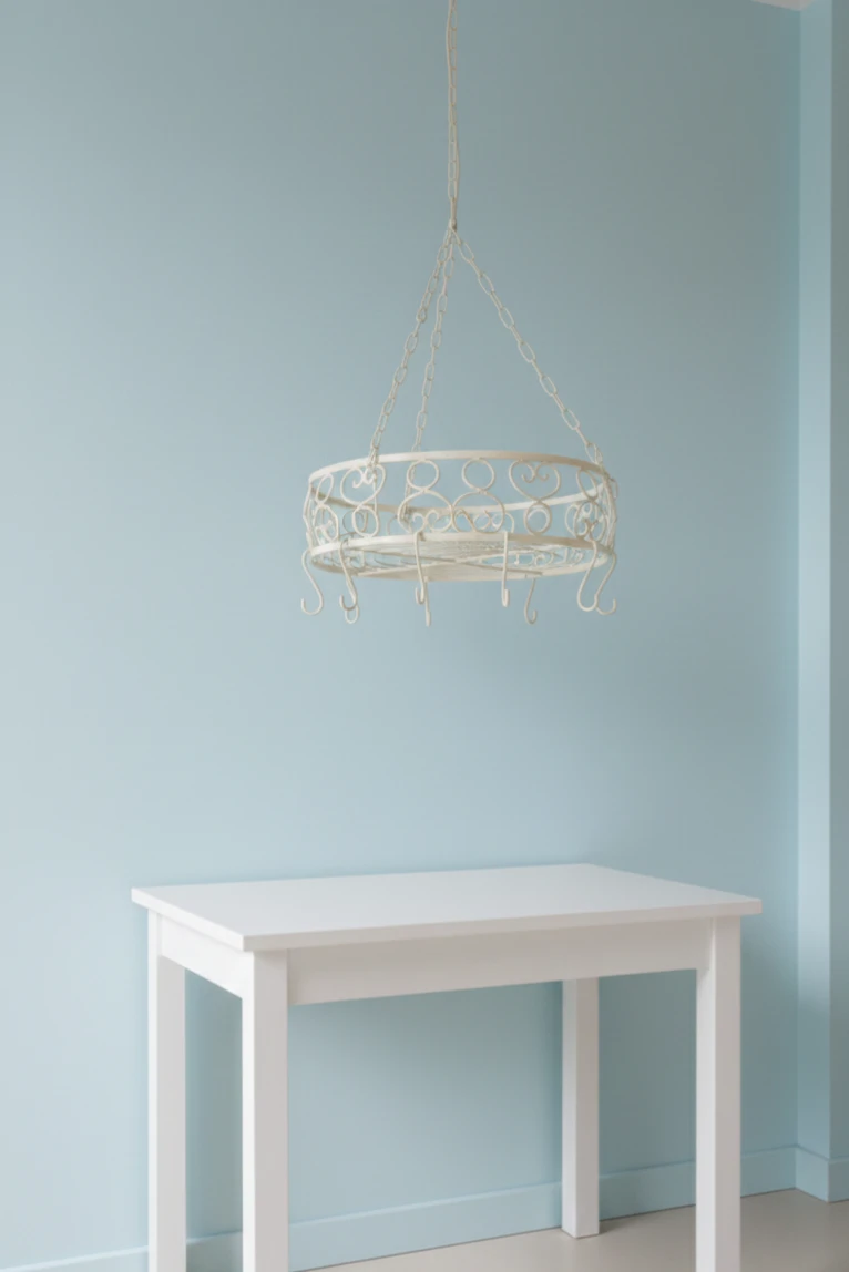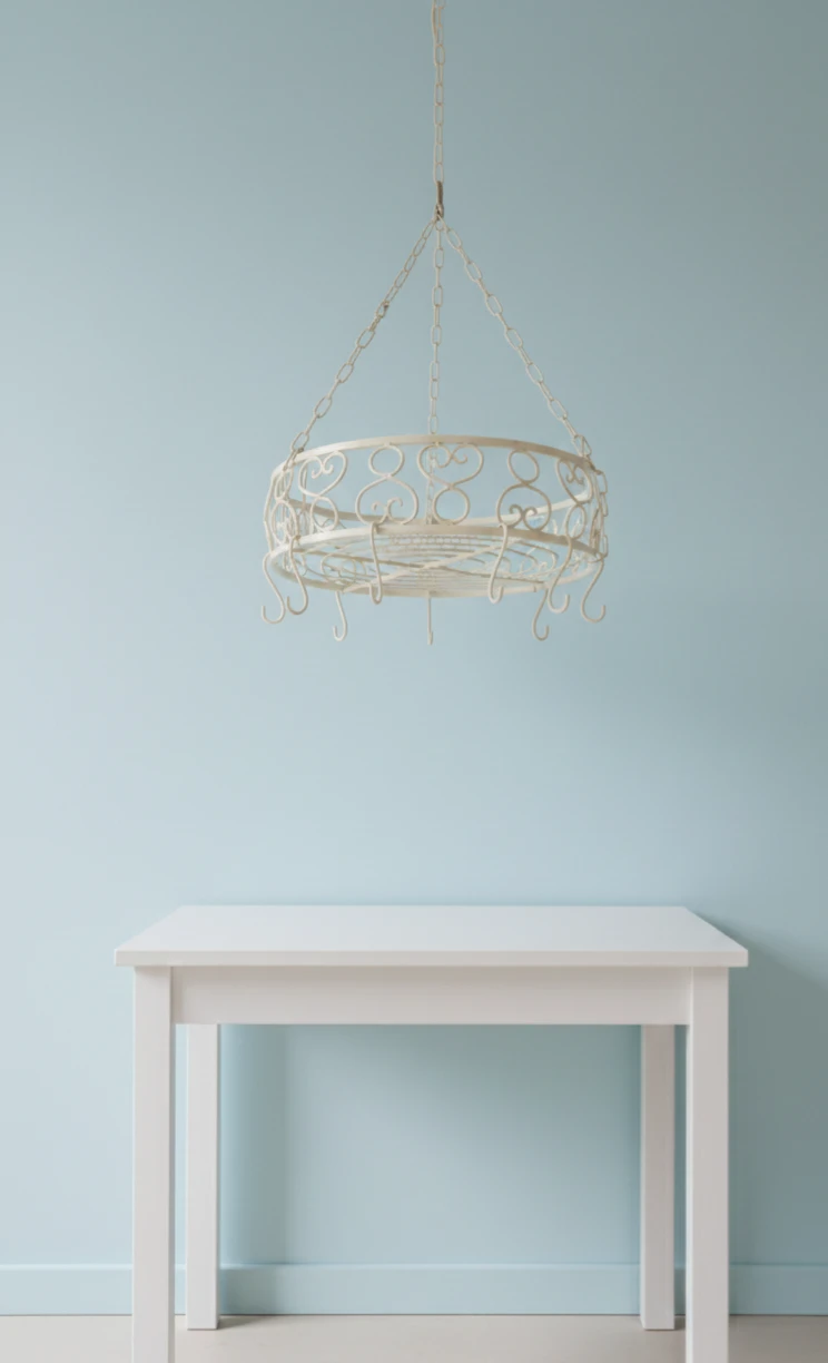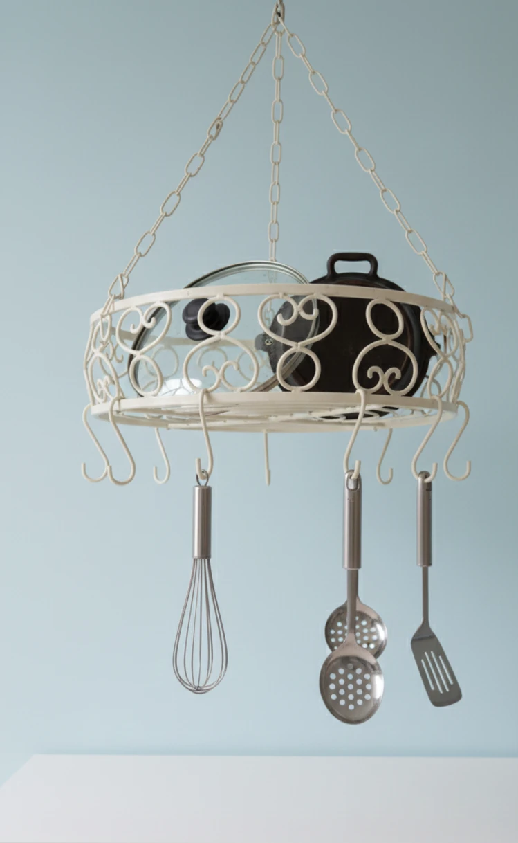 This cream white hanging pot rack is perfect for adding a touch of elegance and functionality to your kitchen. It's great for storing pots, pans, and utensils, keeping them within easy reach while saving cabinet space. The rack features a decorative design and sturdy construction, making it a stylish and practical addition to any home