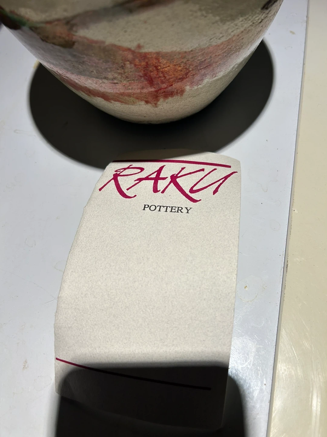 Beautiful Raku pottery vase with a unique glaze. It's handcrafted and features earthy tones with splashes of red and green. This piece would make a lovely decorative accent for any home.