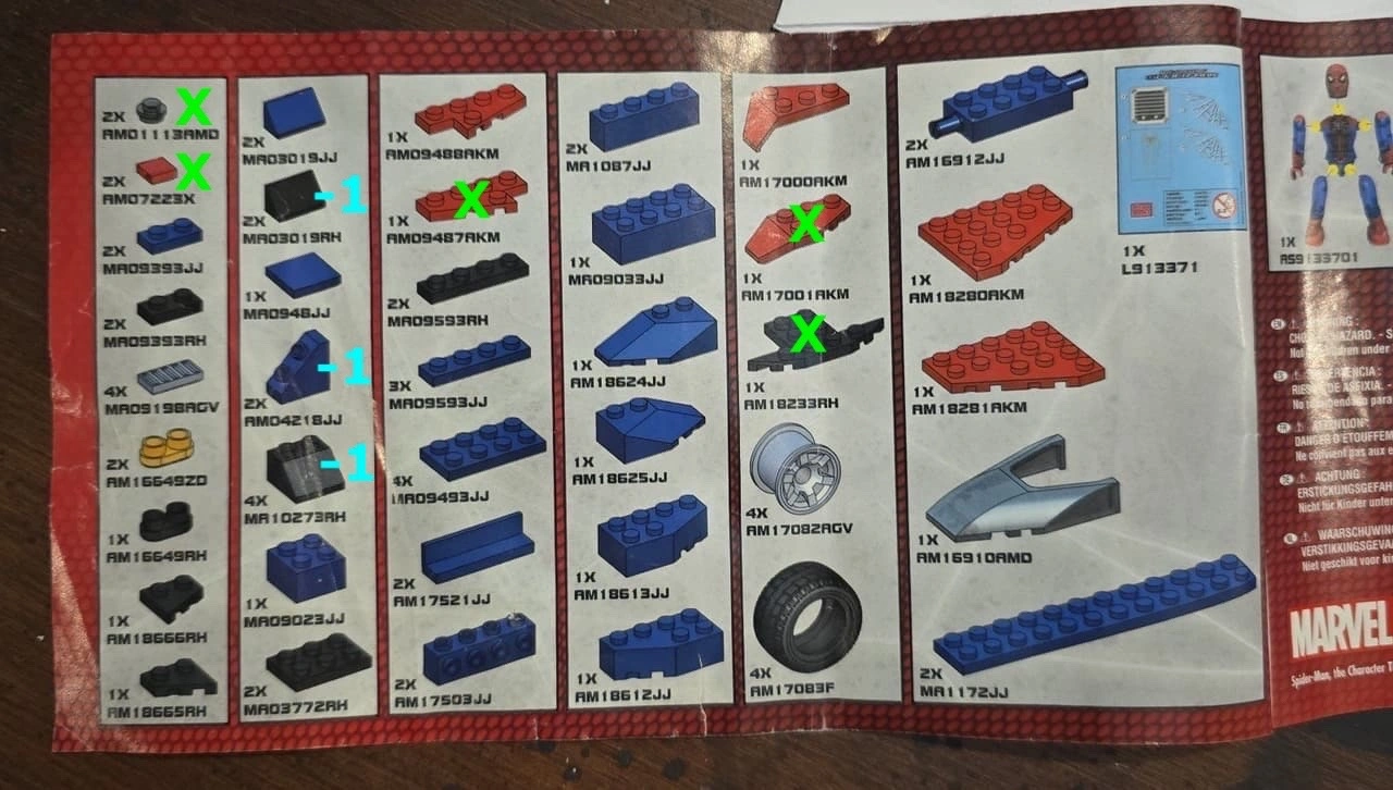 I believe a total of 10 pieces are missing, which I marked up on a visual parts list I found online (see last pic). Please note I’m using one of the black 2 x 3 pieces (MR03773RH) to hold up a few pieces of the speeder front. Also, I noticed that 3 of the rubber tires appear glossy and one is more matte. This is what was included in the box so I believe it’s a manufacturing flaw.