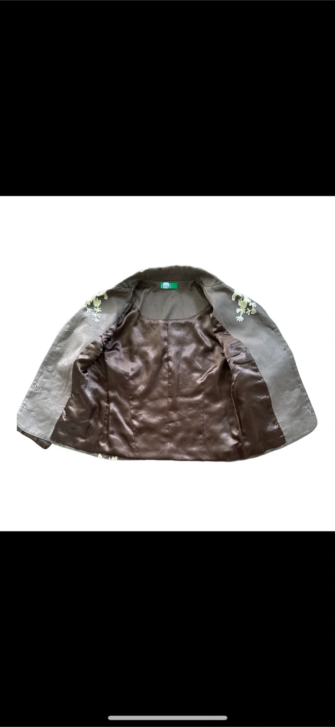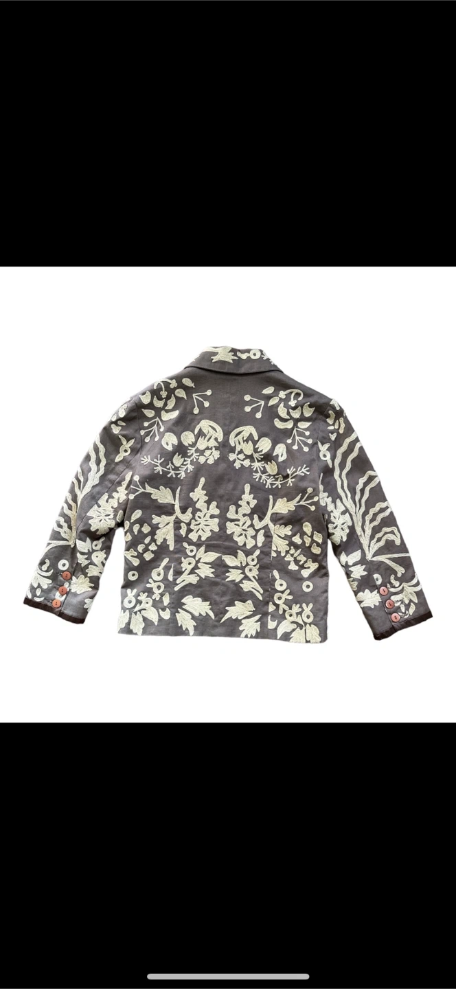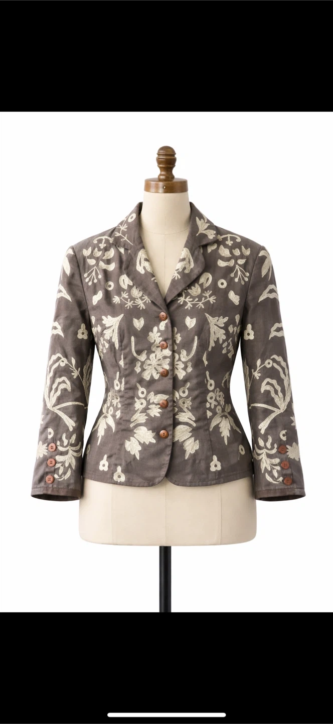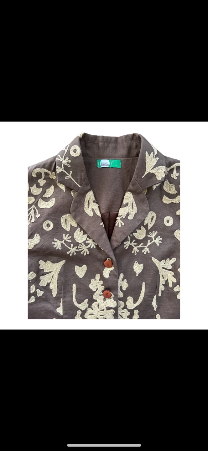 This stylish blazer features an all-over embroidered floral pattern in a cream colour on a brown base.