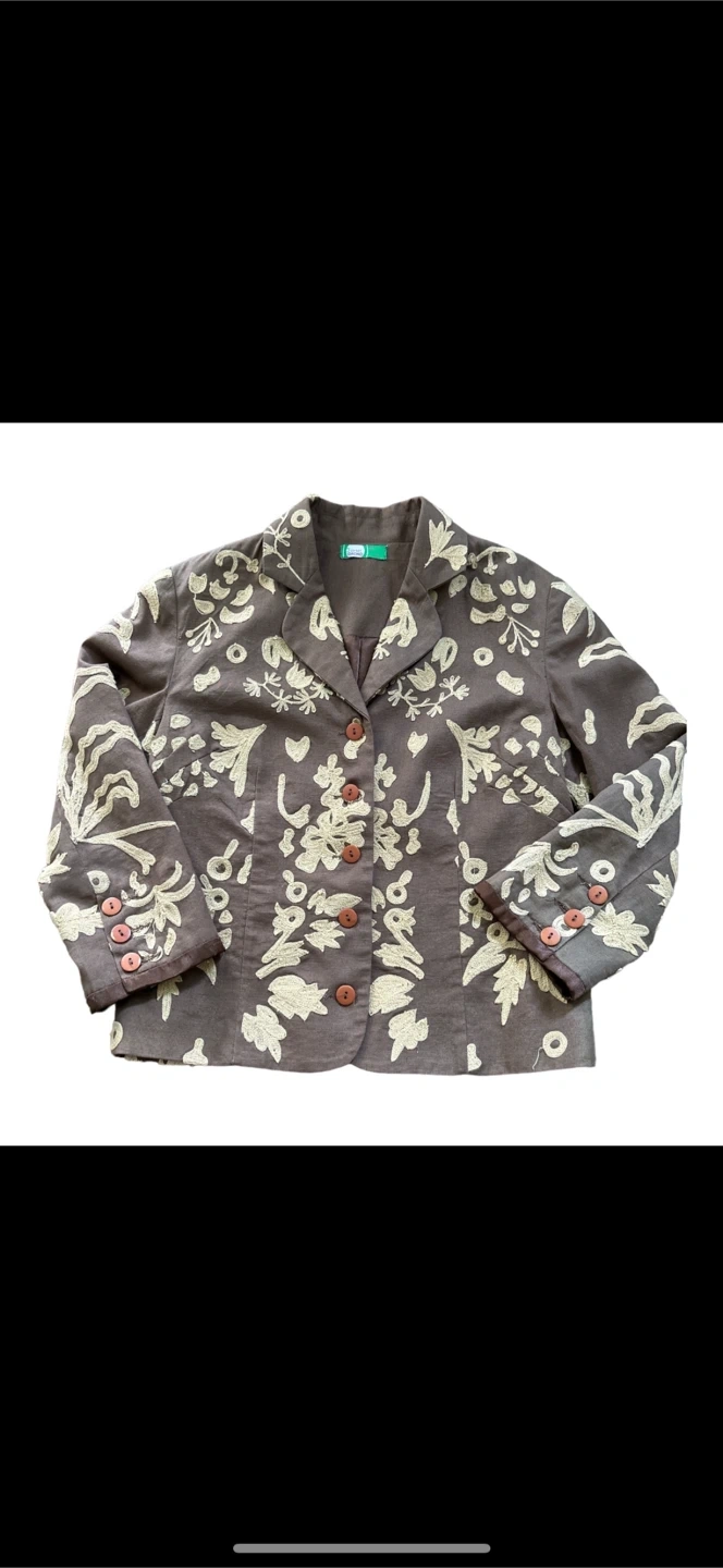 This stylish blazer features an all-over embroidered floral pattern in a cream colour on a brown base.