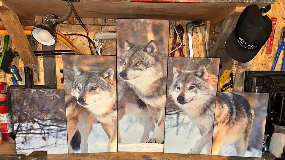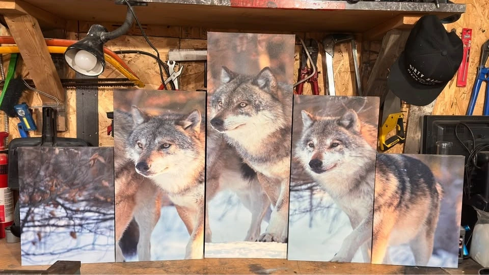 This striking 5 piece wolf canvas art set captures a majestic wolf pack in a snowy landscape, perfect for adding a touch of wilderness to any room. This item is used, but still in very good condition. The set comes ready to hang and transform your living space. The sizes of each canvas are: Two canvases measuring 10 inches x 12 inches, Two canvases measuring 8 inches x 12 inches, and One canvas measuring 8 inches x 18 inches.