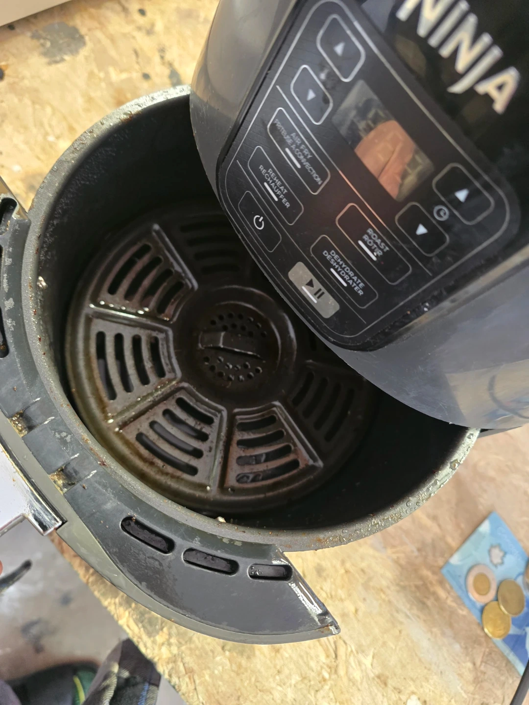 This black Ninja air fryer offers multiple cooking functions including air fry, convection, reheat, dehydrate, and roast. It's a handy appliance for quick meals. The basket has a non-stick coating.