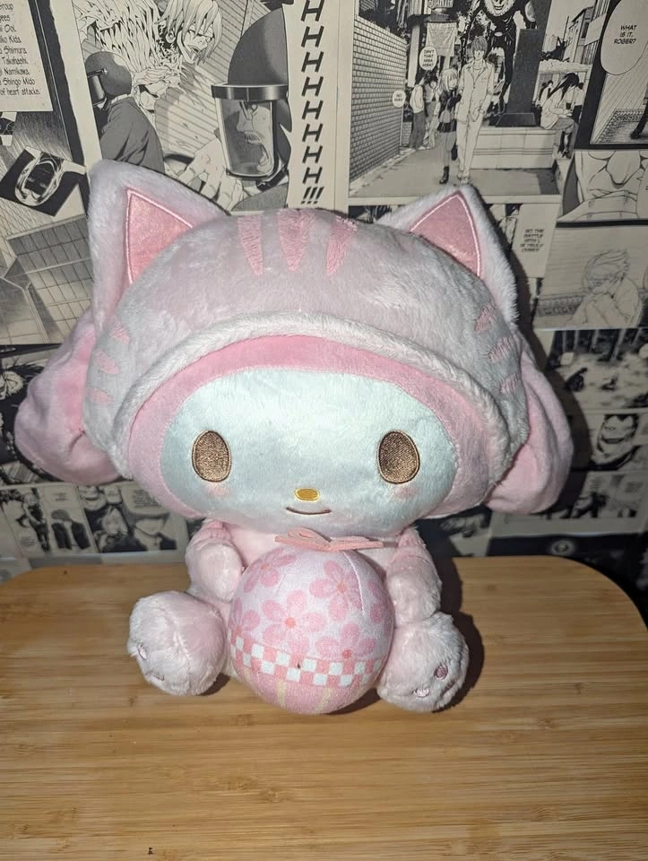 Selling a rare My Melody plush featuring her in a pink cat-eared hood with cherry blossom (sakura) details. She is holding a matching patterned floral ball. This is a NEW/UNUSED item, a Direct Japan Import and Authentic Japanese Prize Figure. It's clean and from a smoke-free home. Check out my listings for more items!