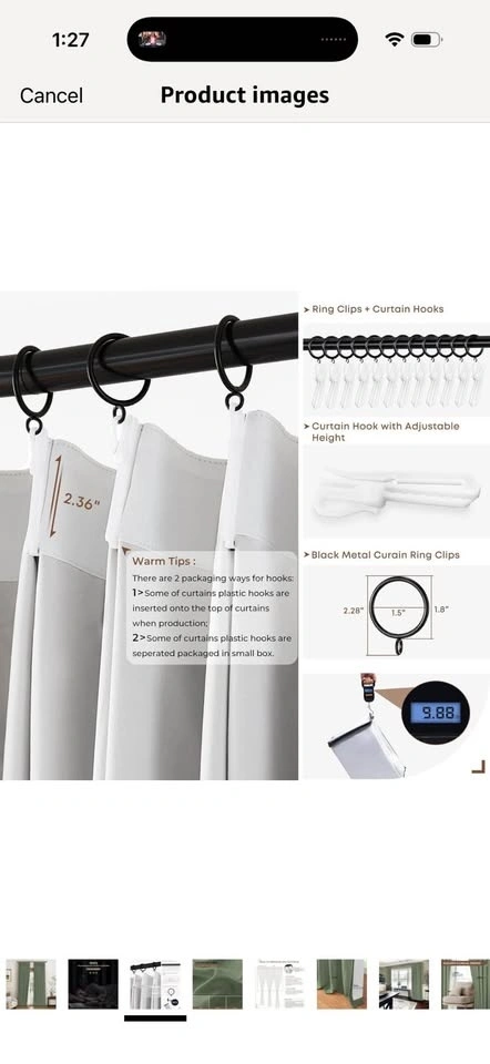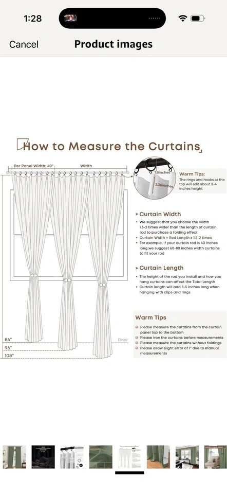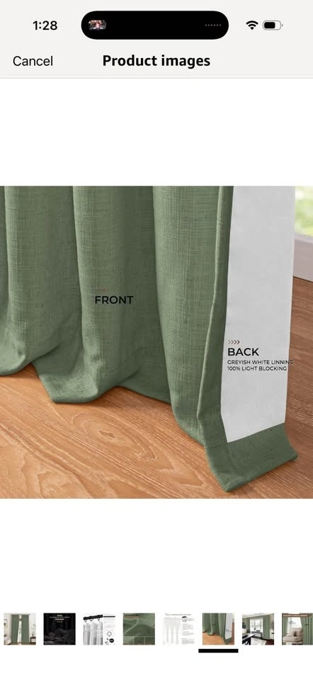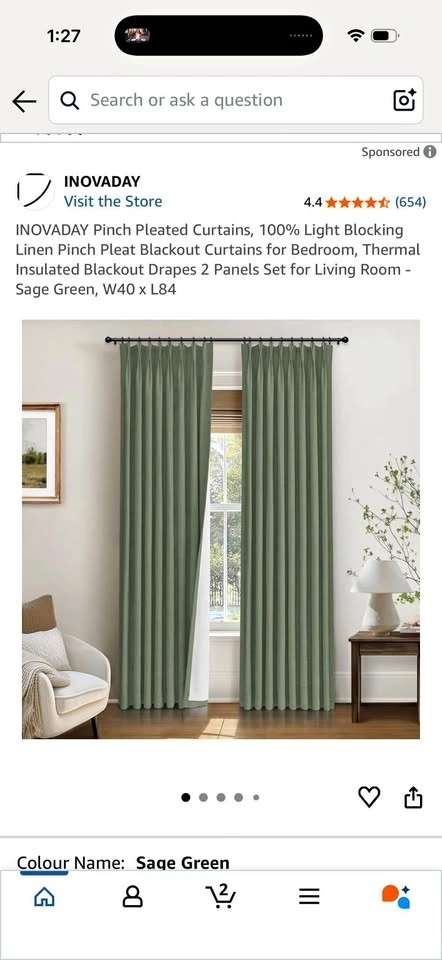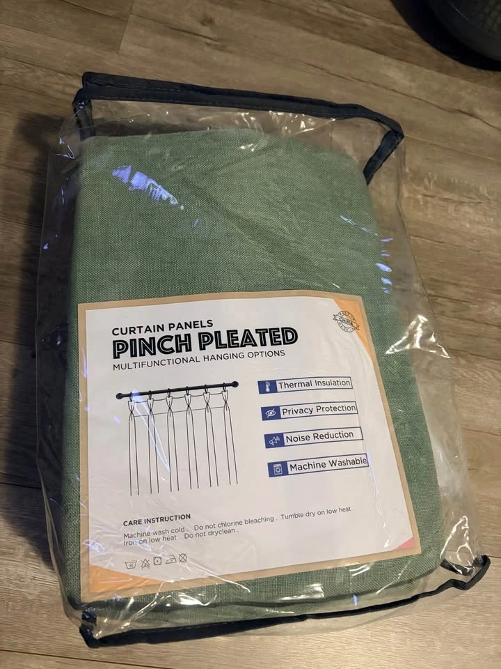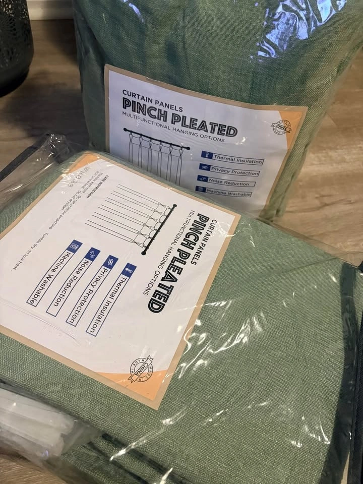 New pinch pleated drapes in Sage green, 40x84". Each pack includes 2 panels. These come with curtain rings and plastic hooks (hooks are pre-inserted, rings are separate). Fits up to 1.5" curtain rods. Made from a linen-blend fabric (10% Linen, 90% Polyester) with a 100% Polyester Blackout Lining. They offer a natural look, are wrinkle-free, and brighten your space. The curtains provide 100% blackout, thermal insulation, and noise reduction for complete darkness and privacy. Each panel has 6 pinch pleats for an elegant look that fits various room styles. Machine washable for easy care. Warm iron or steam iron and tumble dry on low if needed.