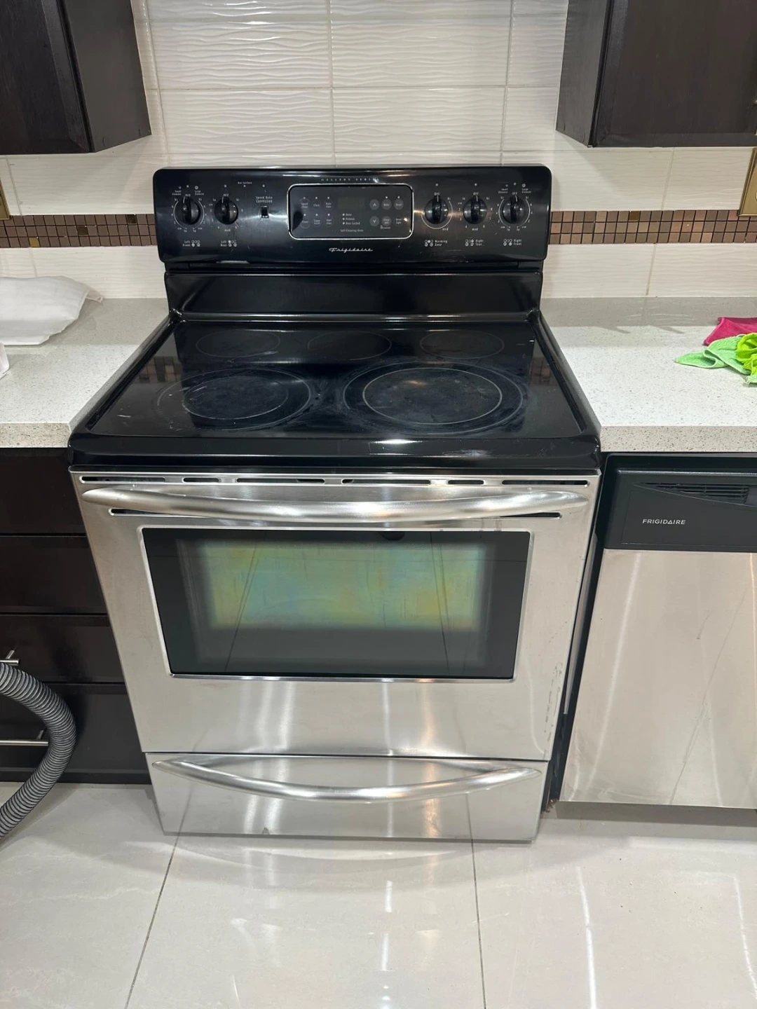 This is a Frigidaire electric range with a glass cooktop and a stainless steel finish. It has four burners and an oven. The oven has a storage drawer at the bottom. Pick up @ Long branch, Etobicoke. Call this number 647 949 2962 now