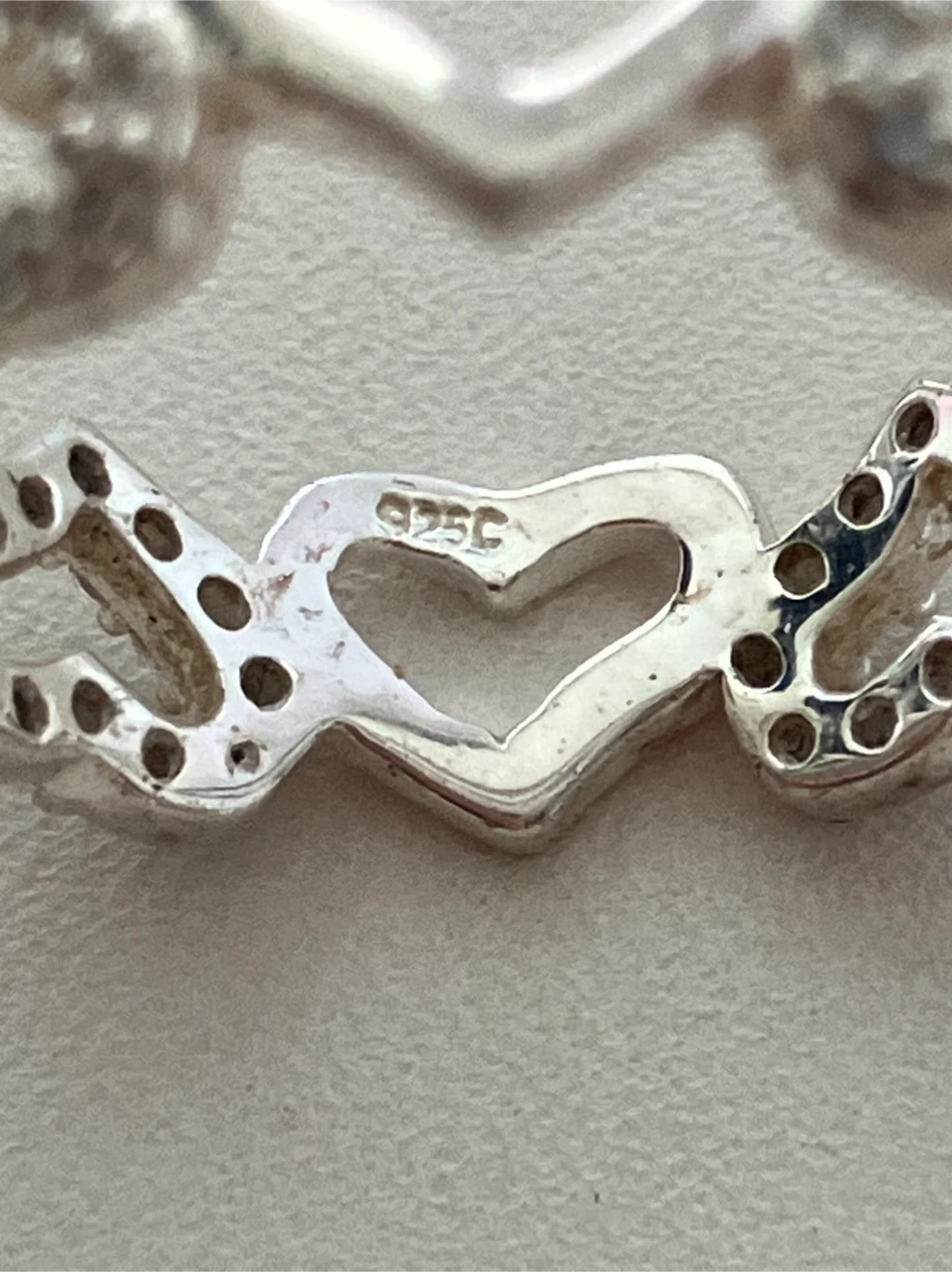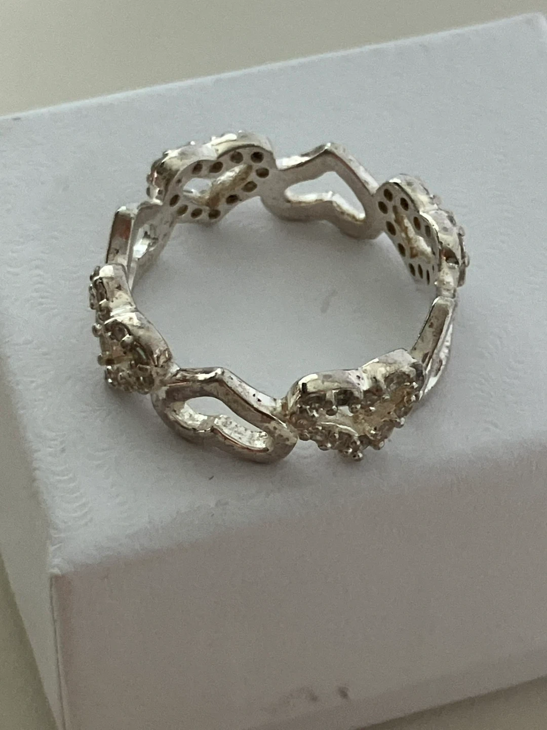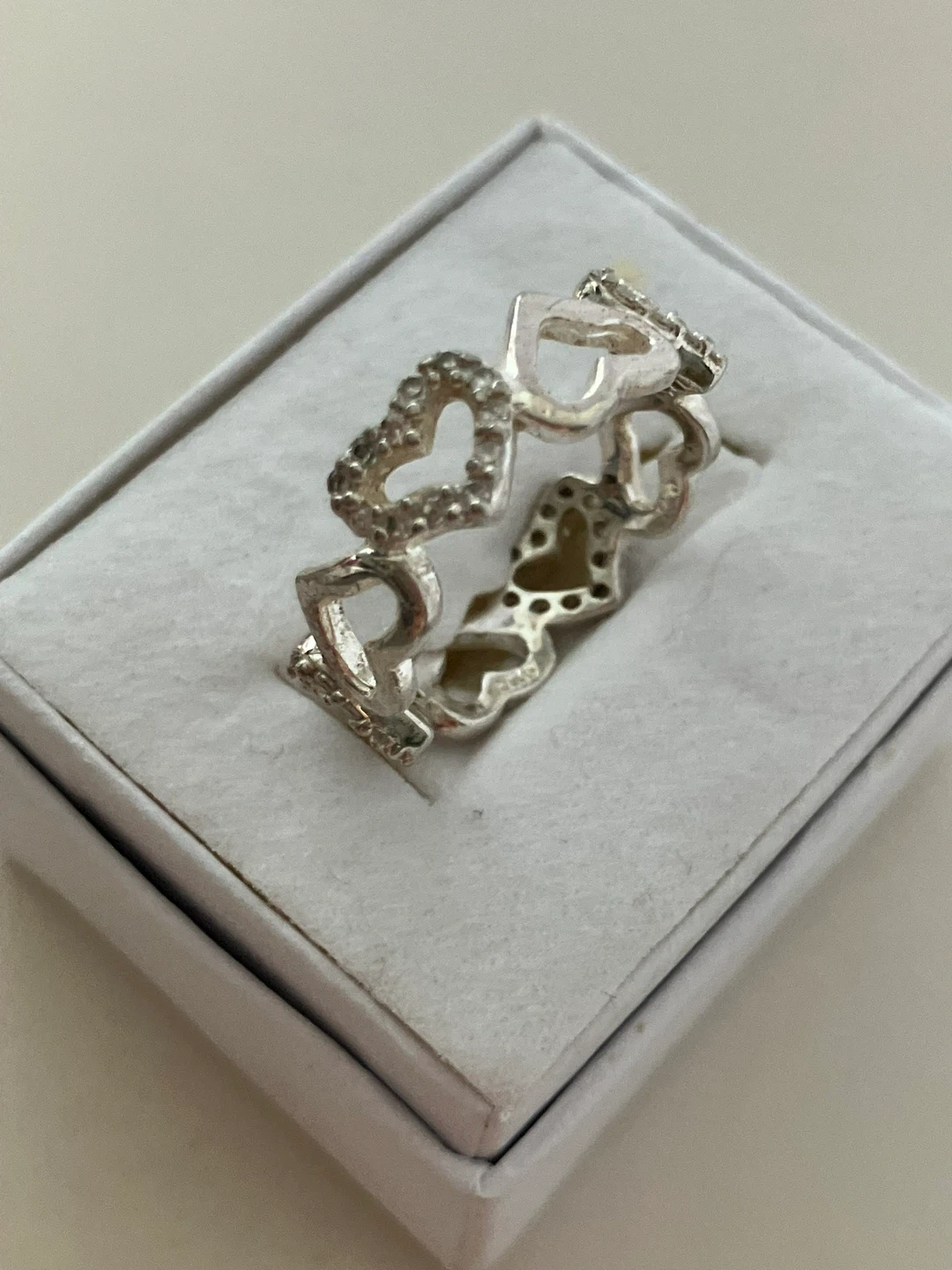 Sterling silver band ring size 7.75, featuring a repeating heart design. Some hearts are accented with small cubic zirconia stones for a touch of sparkle. Comes in a presentation box.