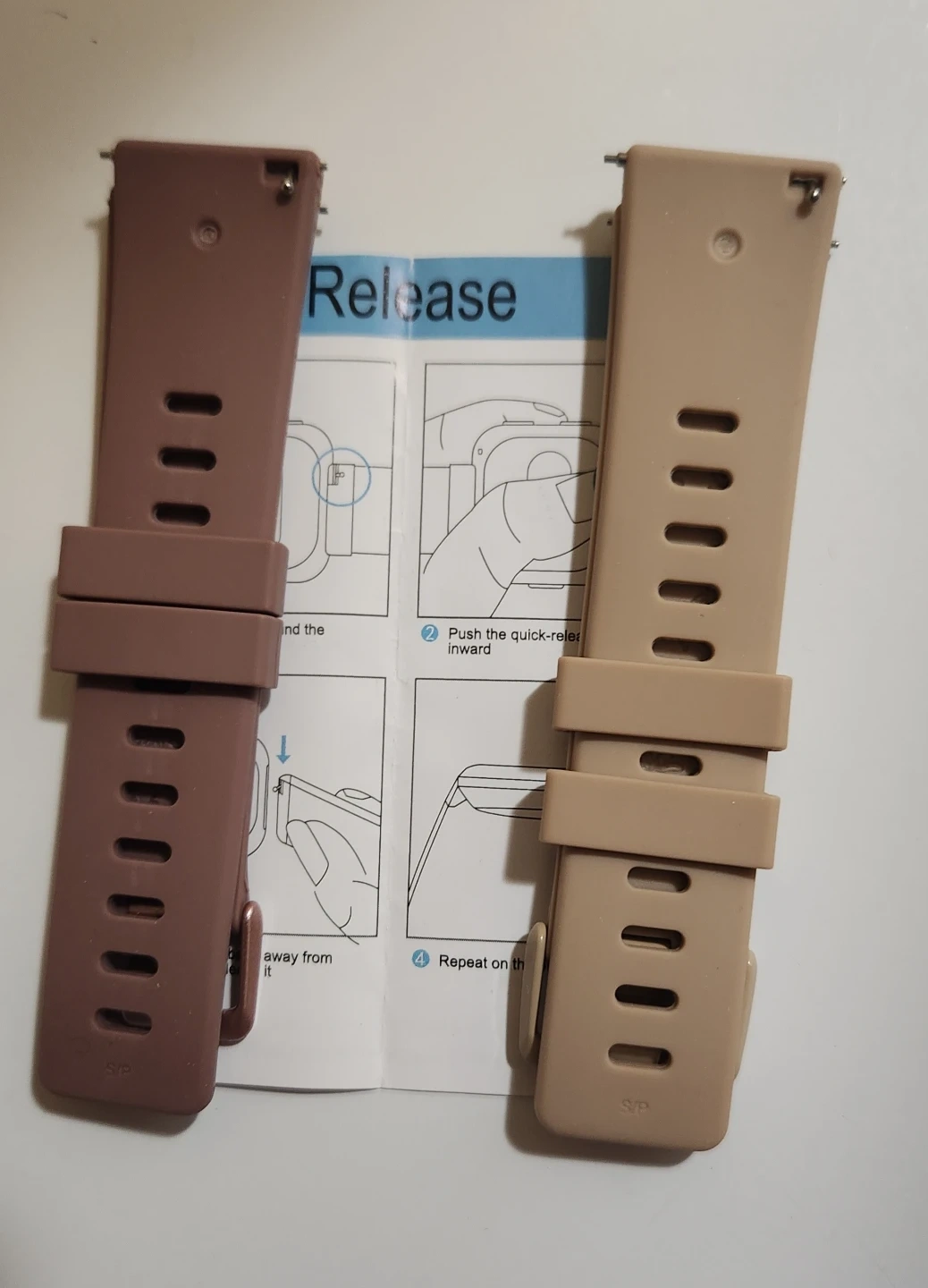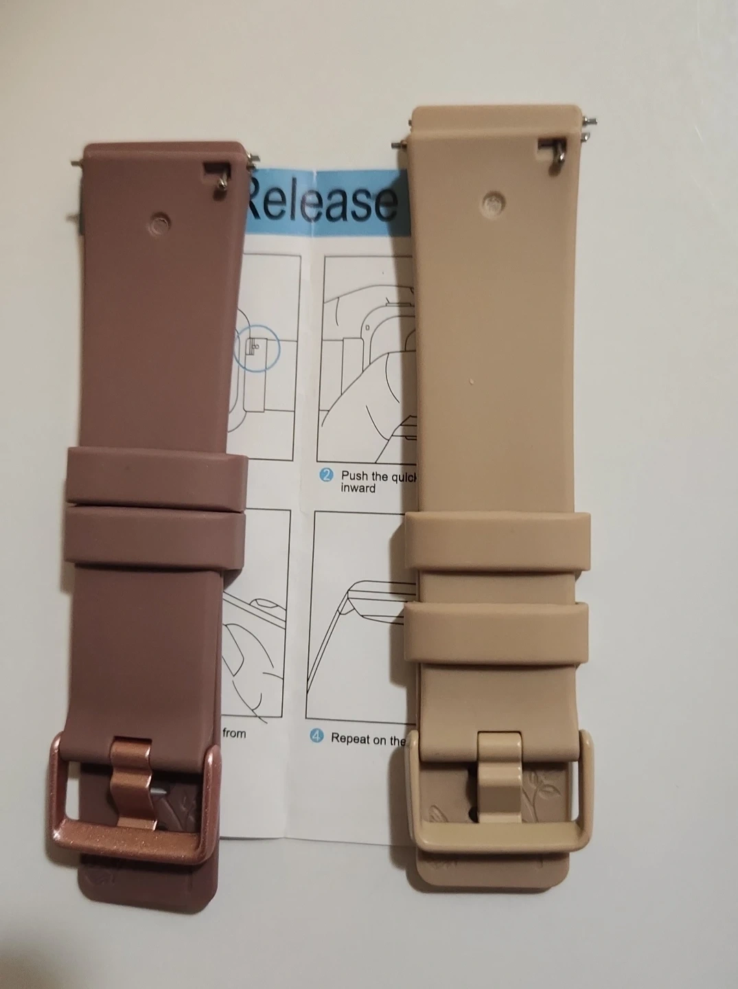 Set of two watch bands, one in a deep brown and the other in a tan colour. Each band features adjustable sizing with a buckle closure. Silicone material.