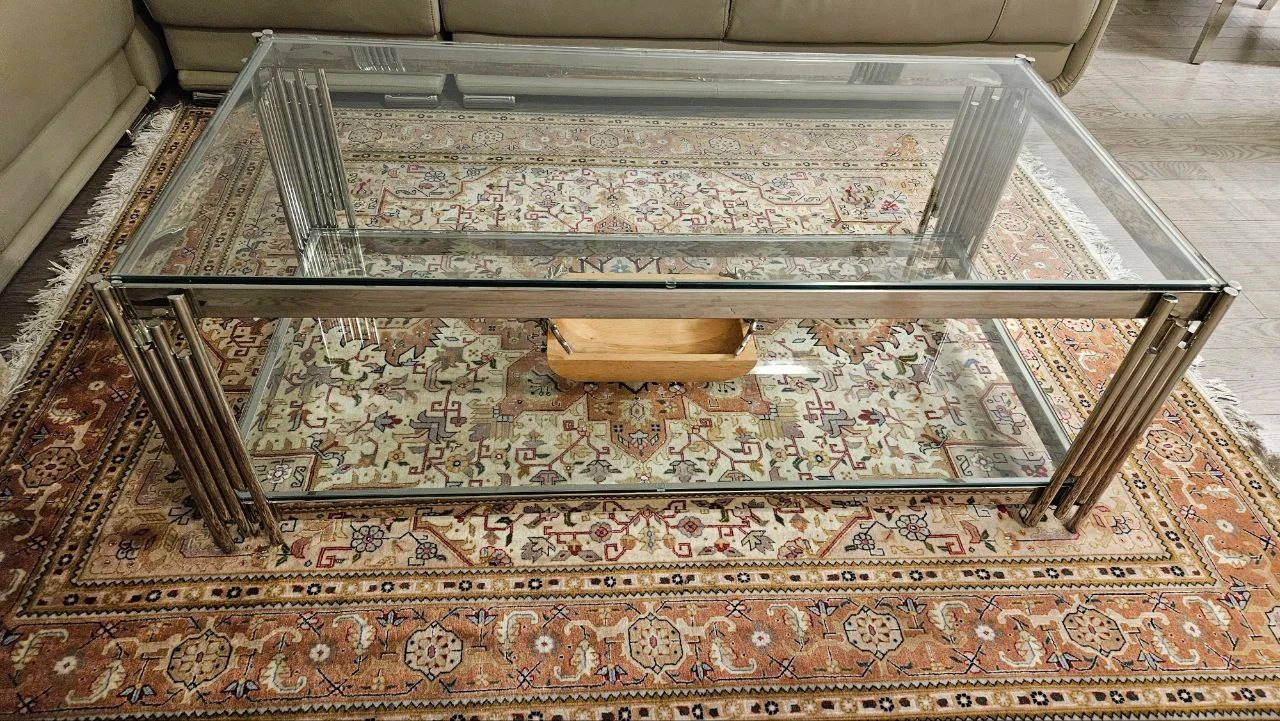 Selling a glass coffee table with a silver frame! It's in great shape and would look lovely in any living room.