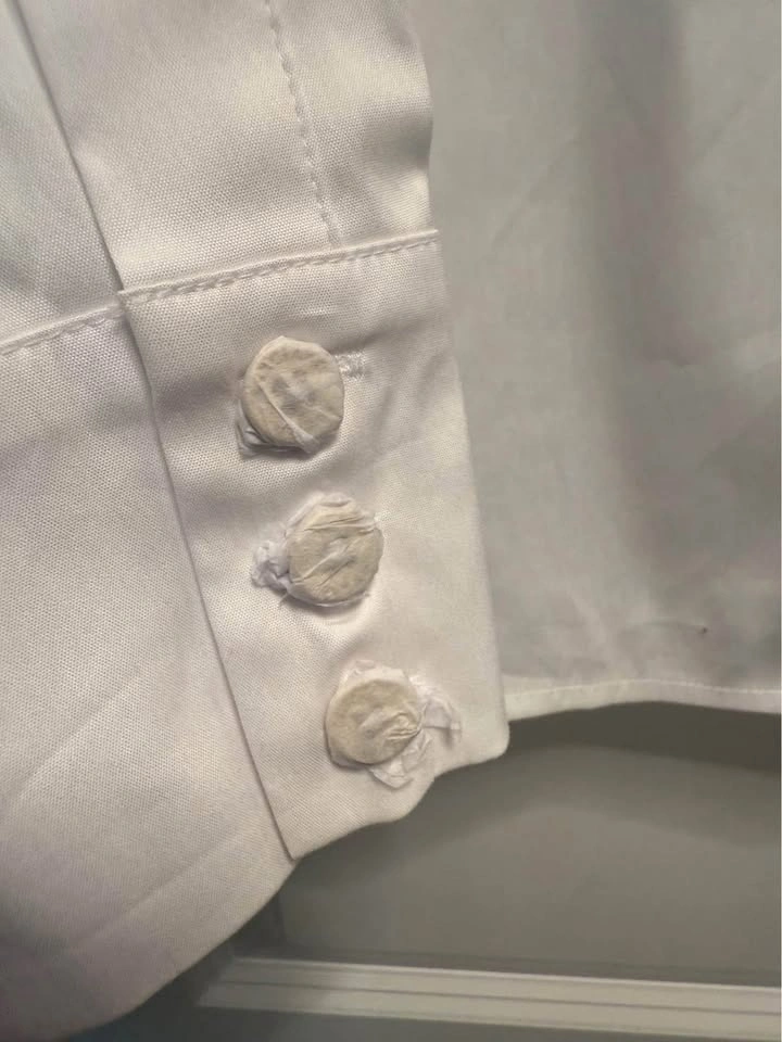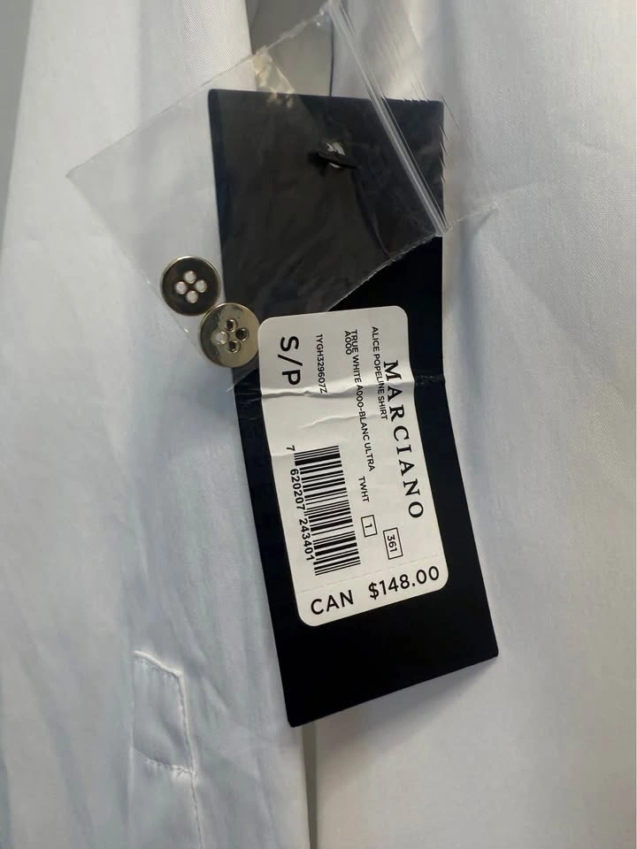 BNWT Marciano Alice poplin tailored shirt with gold button details. Crisp cotton-blend shirt featuring a tailored fit with clean folded collar, long sleeves and concealed front button closure. Size: Small
