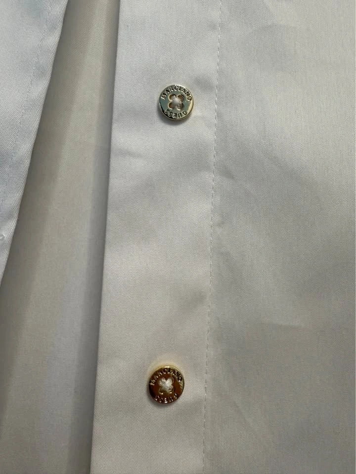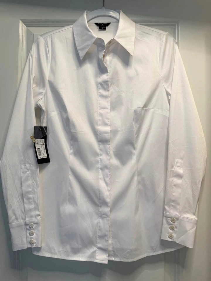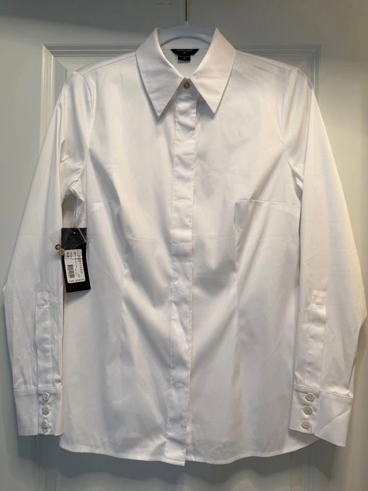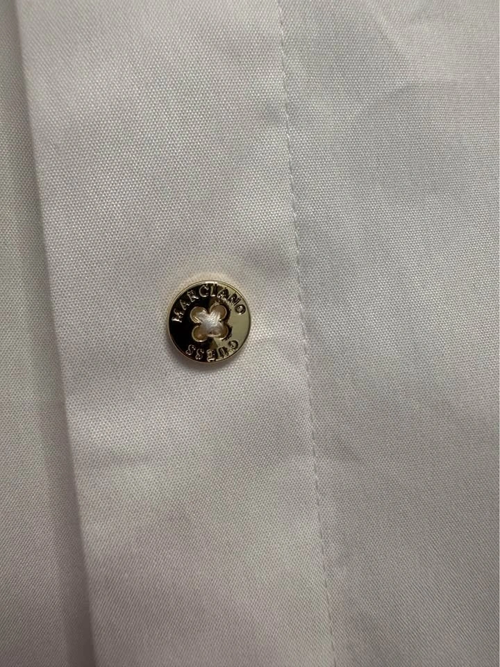 BNWT Marciano Alice poplin tailored shirt with gold button details. Crisp cotton-blend shirt featuring a tailored fit with clean folded collar, long sleeves and concealed front button closure. Size: Small