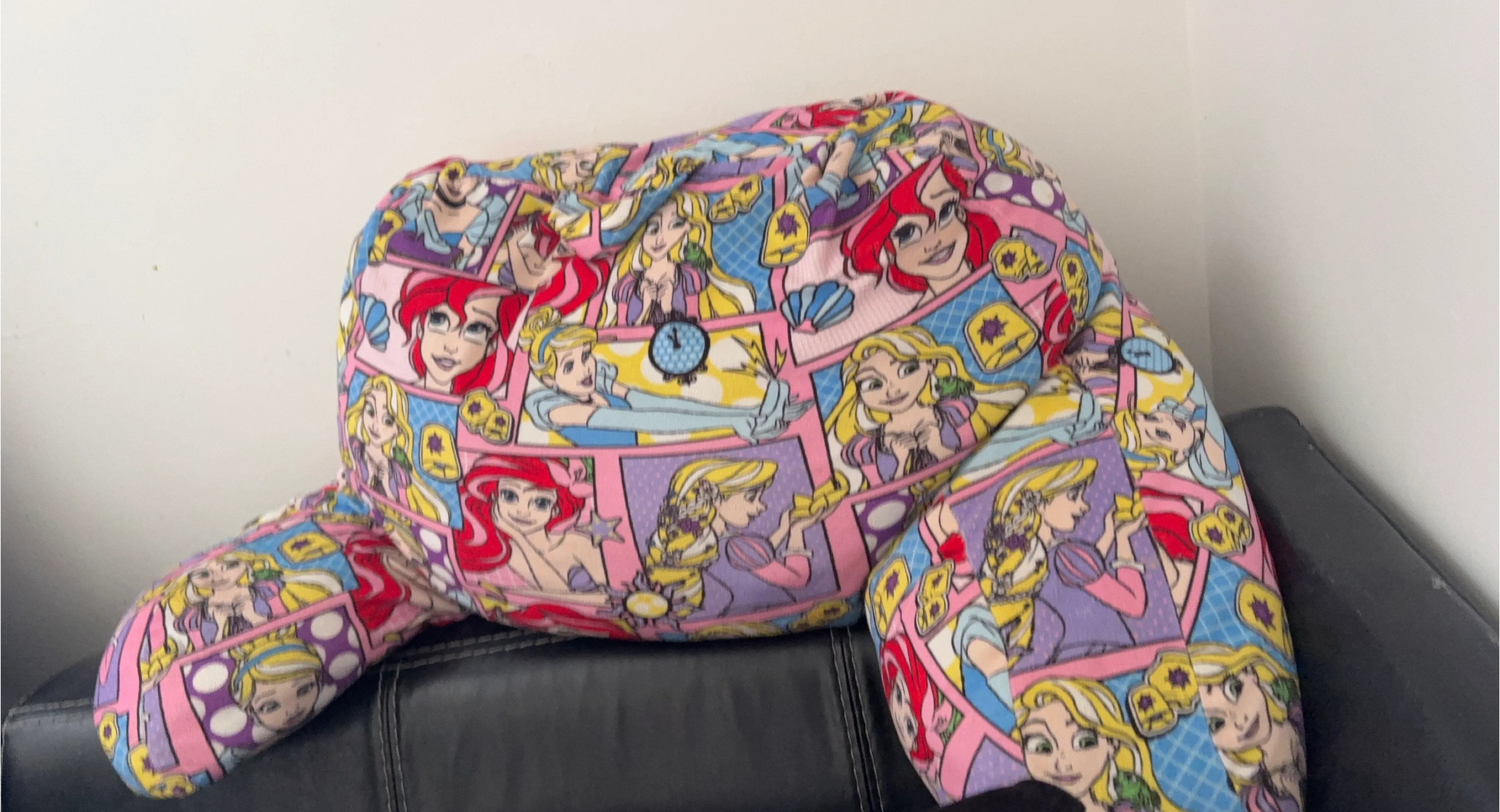 This comfy reading pillow features a colourful print of Disney Princesses like Ariel, Rapunzel, and Cinderella. It's designed to provide support while reading or relaxing. It's made from soft fabric with a fun comic-book style pattern.