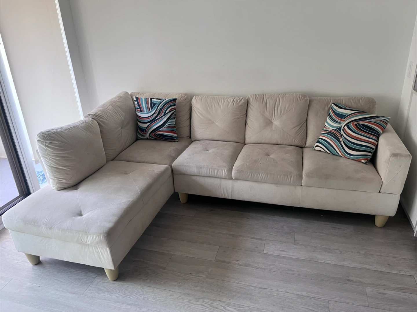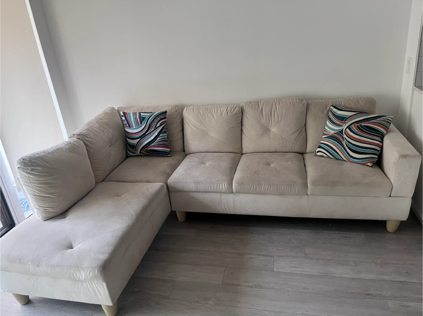 Comfortable beige sectional sofa with a chaise lounge. It's upholstered in a soft fabric and includes two decorative throw pillows. The cushions are tufted for a stylish look. This sofa's a great addition for lounging and entertaining!