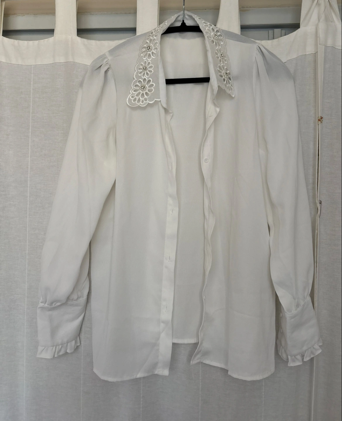 A lovely white blouse with a unique lace collar! It's in great condition and ready for a new home. The sleeves have a slight puff and ruffles at the cuff. Perfect for dressing up or down!