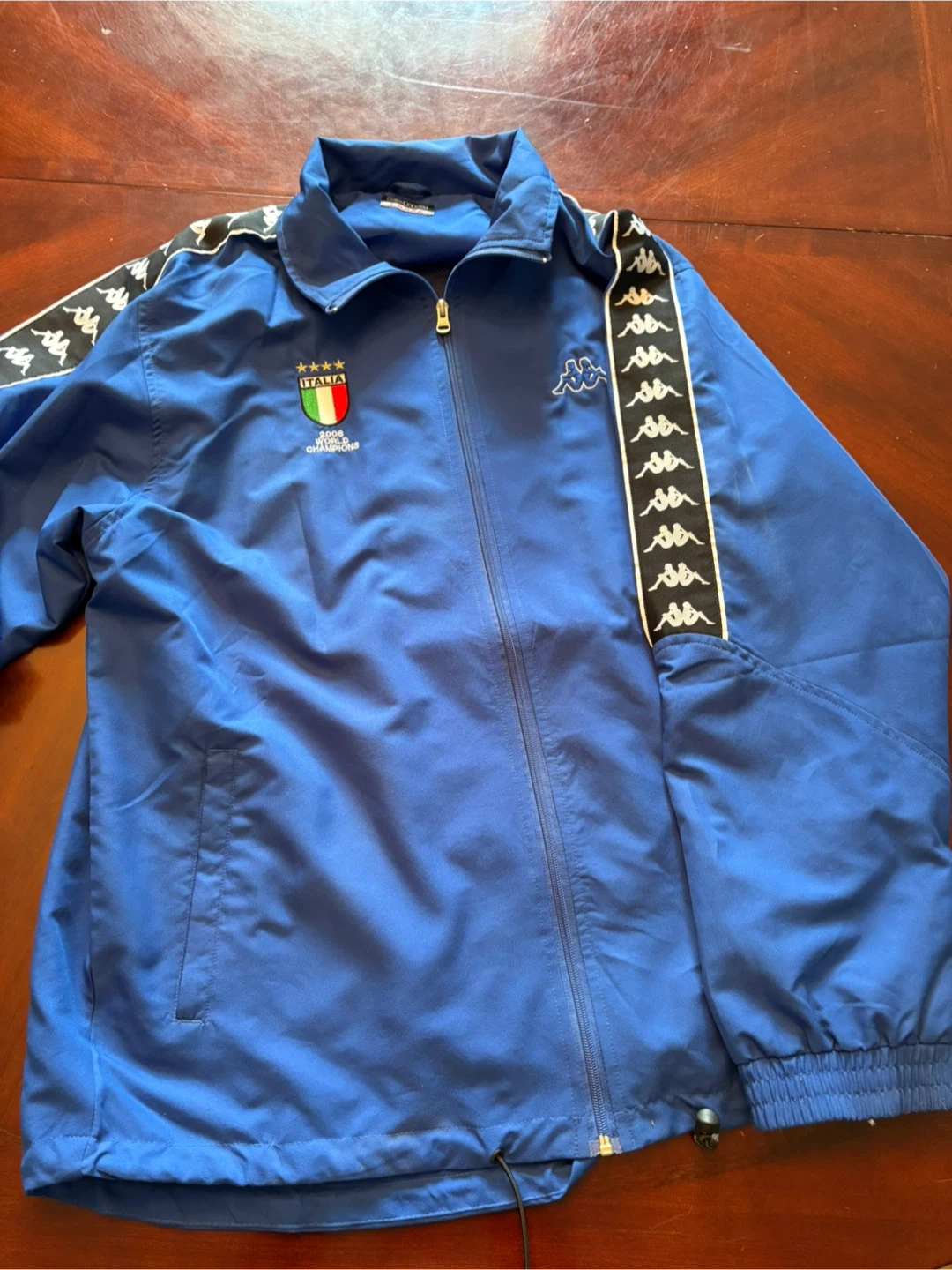 Blue Kappa track jacket celebrating the Italia 2006 World Champions. It features the iconic Kappa Omini logo taping on the sleeves. Zippered front closure with side pockets.