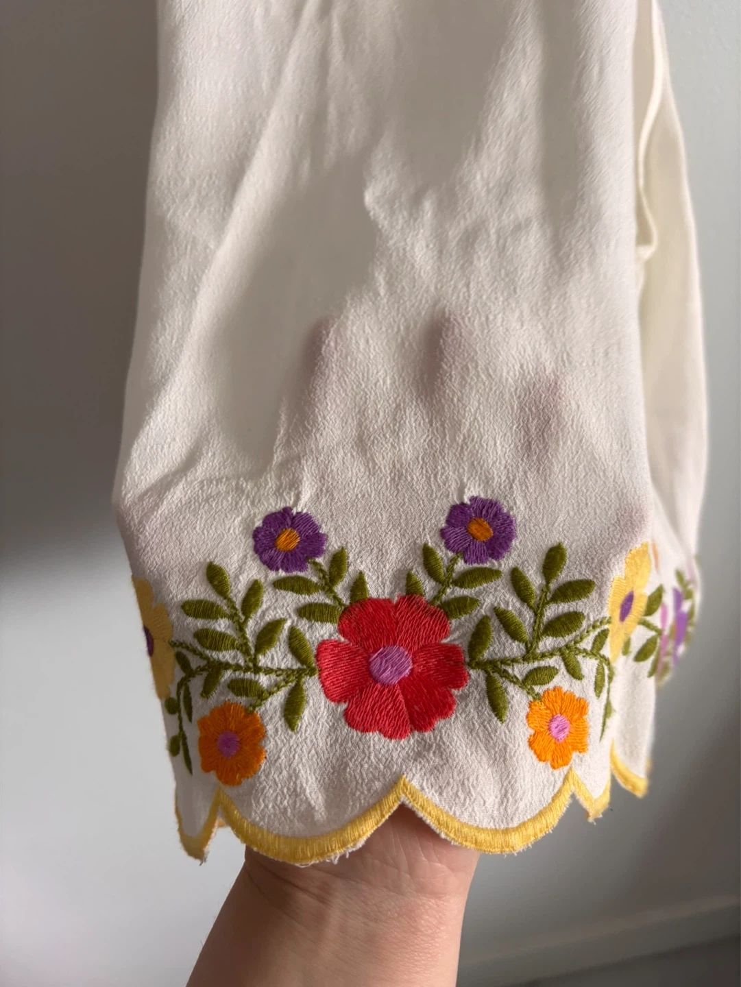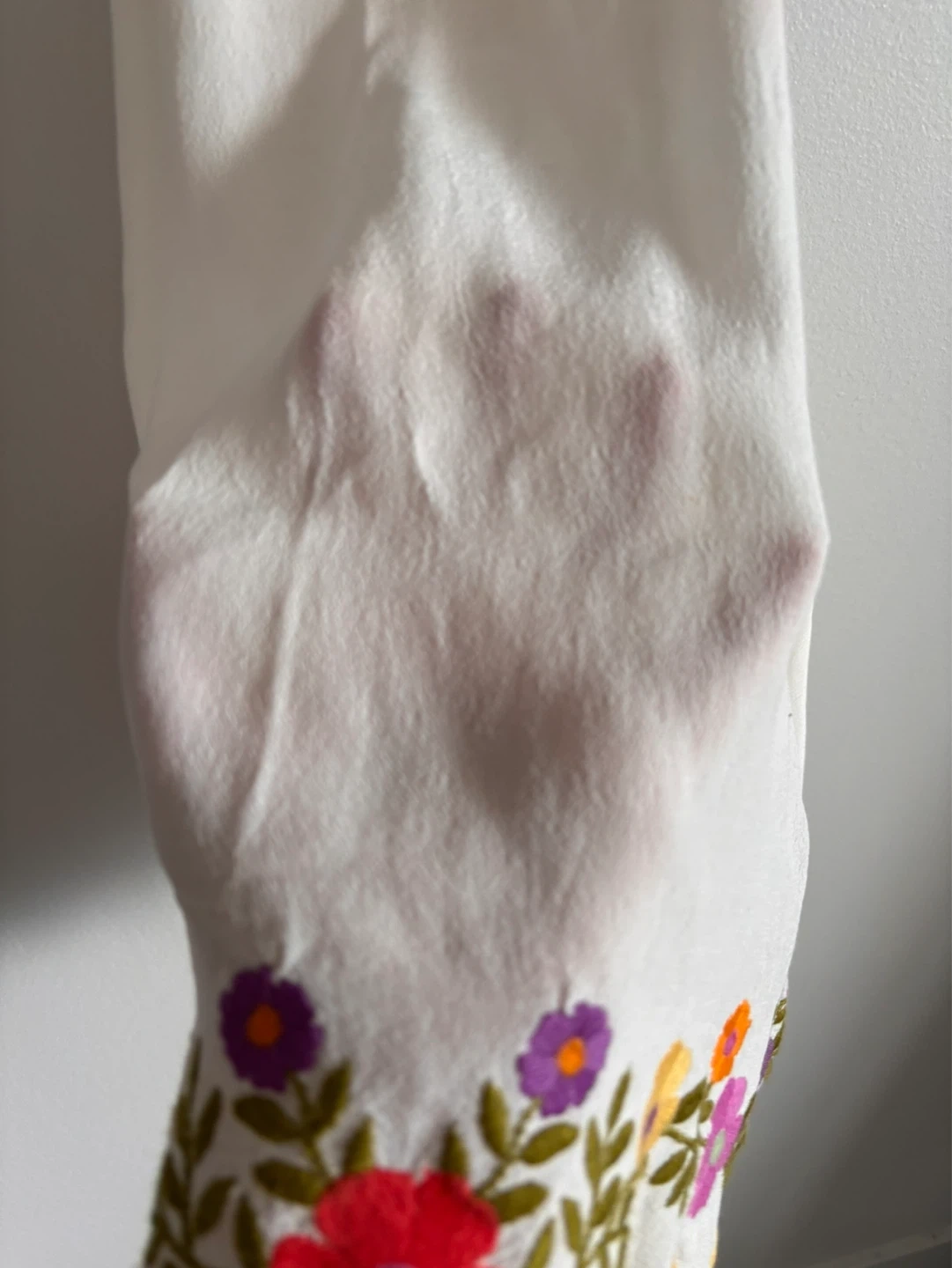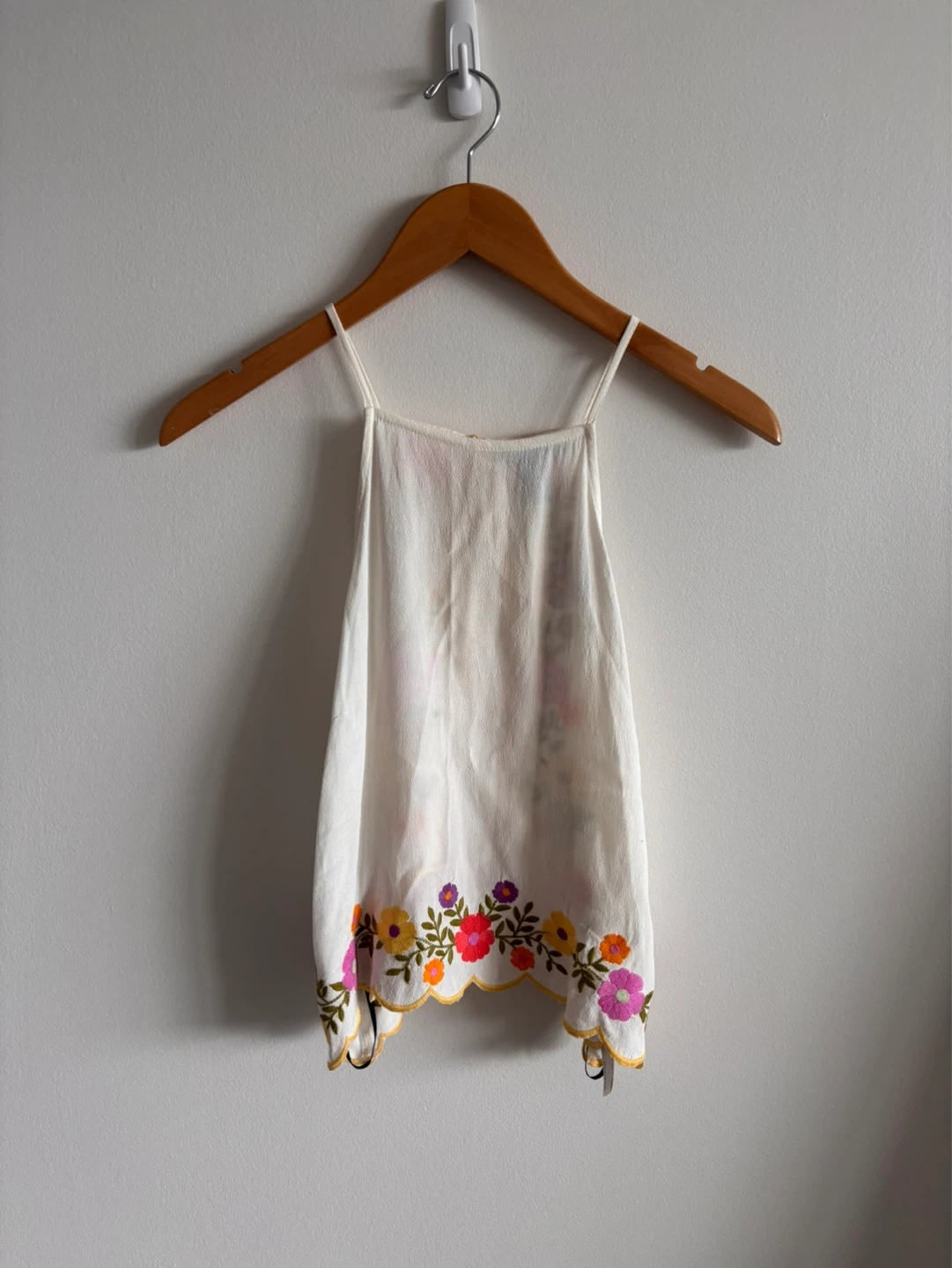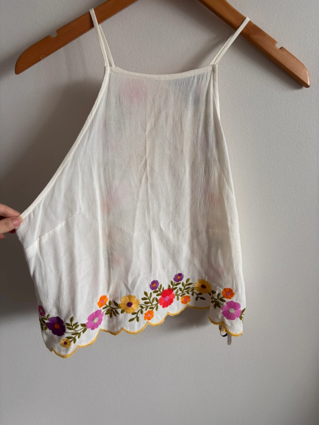 White halter top with colourful floral embroidery along the hem. It has thin spaghetti straps and a scalloped hemline. Lightweight fabric.