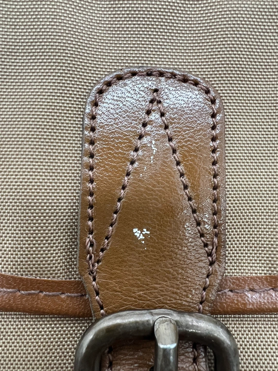 Faint white mark on the leather trim.