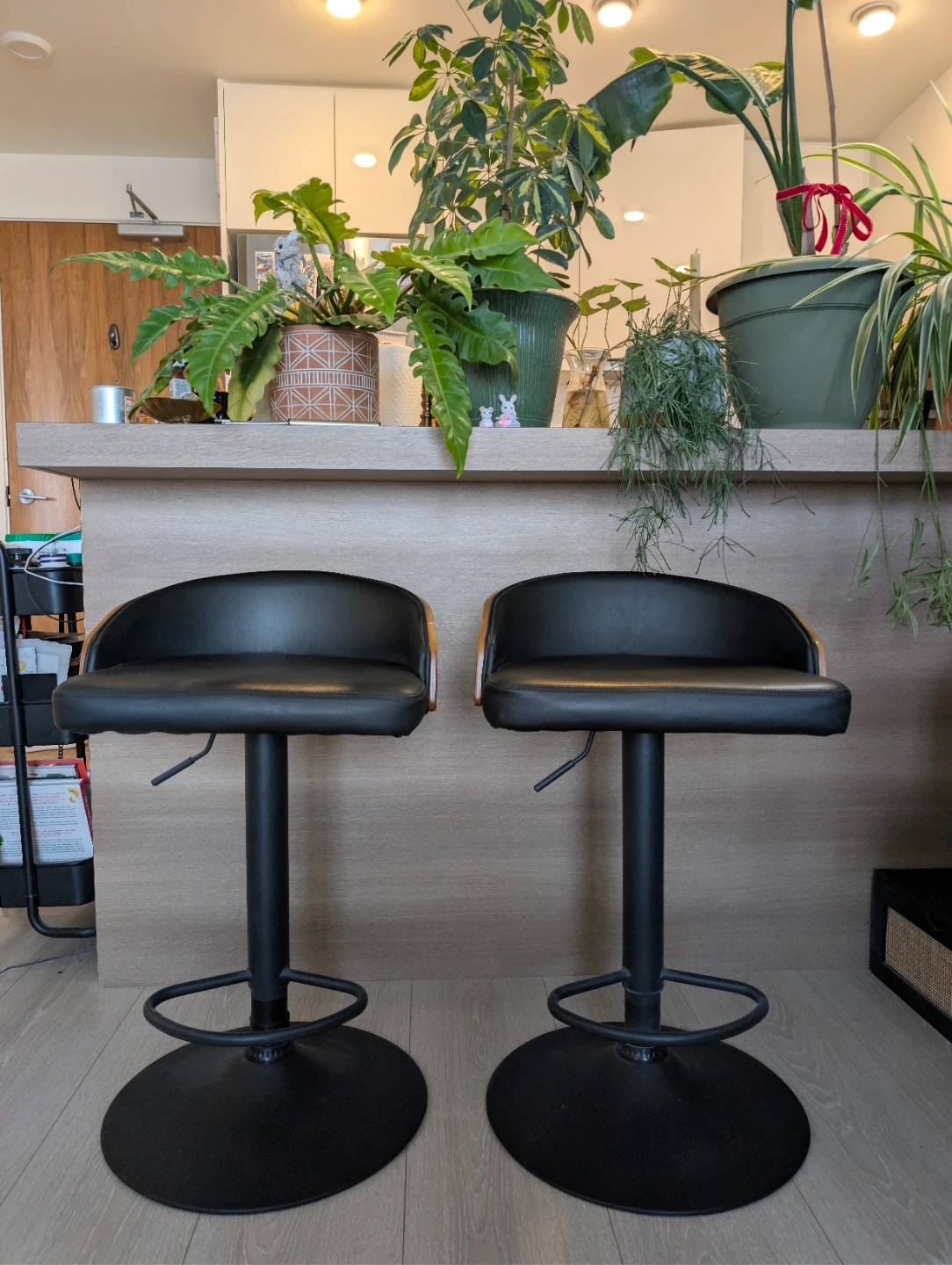 Two stylish bar stools with a black faux leather seat and a curved wood-finish back. They're adjustable in height.