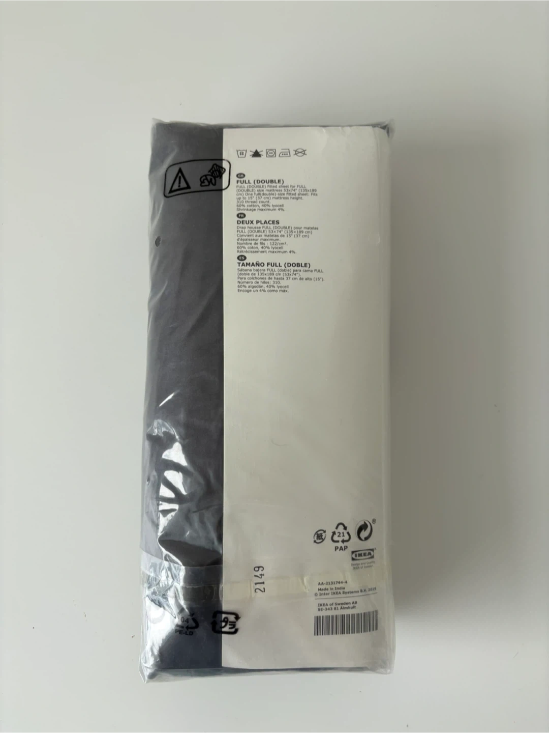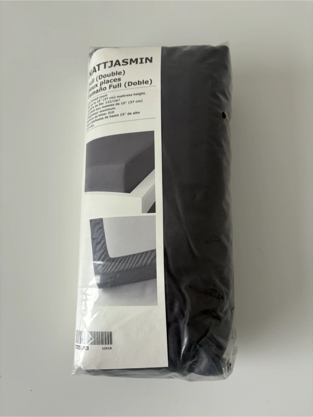 This is an IKEA NATTJASMIN fitted sheet in Full (Double) size. It's made of 100% cotton for comfort. The sheet fits mattresses up to 15 inches (37 cm) high. It's a great way to update your bedding!