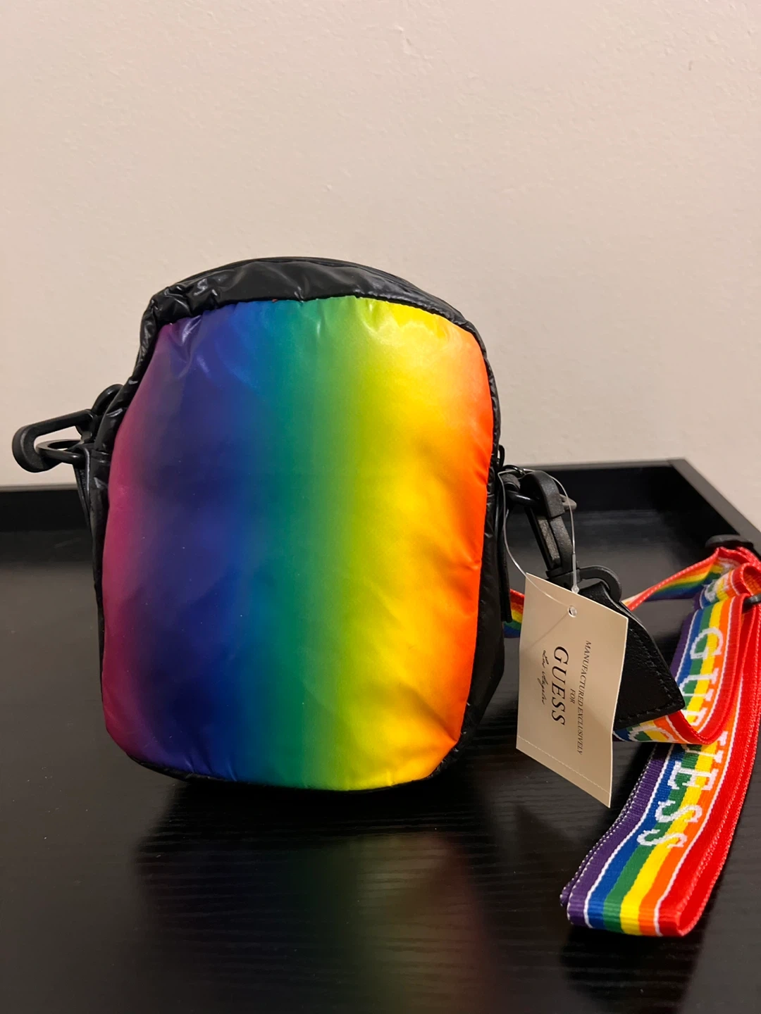 This Guess crossbody bag is in great condition! It features a black, puffy exterior with a rainbow stripe shoulder strap and rainbow gradient on the backside. Perfect for adding a pop of colour to any outfit!