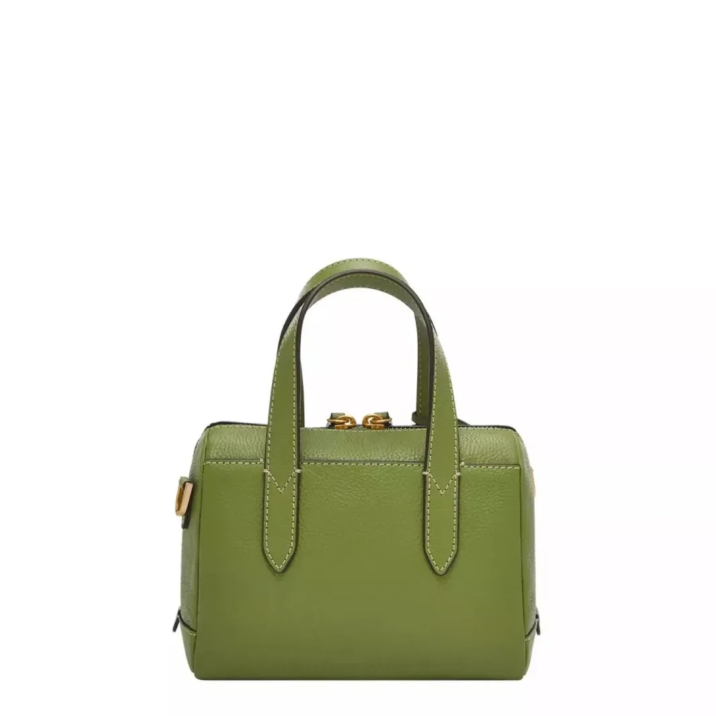 This is a lime green leather satchel purse by Fossil. It features a top zip closure and a detachable crossbody strap. It's a compact size, perfect for everyday essentials!