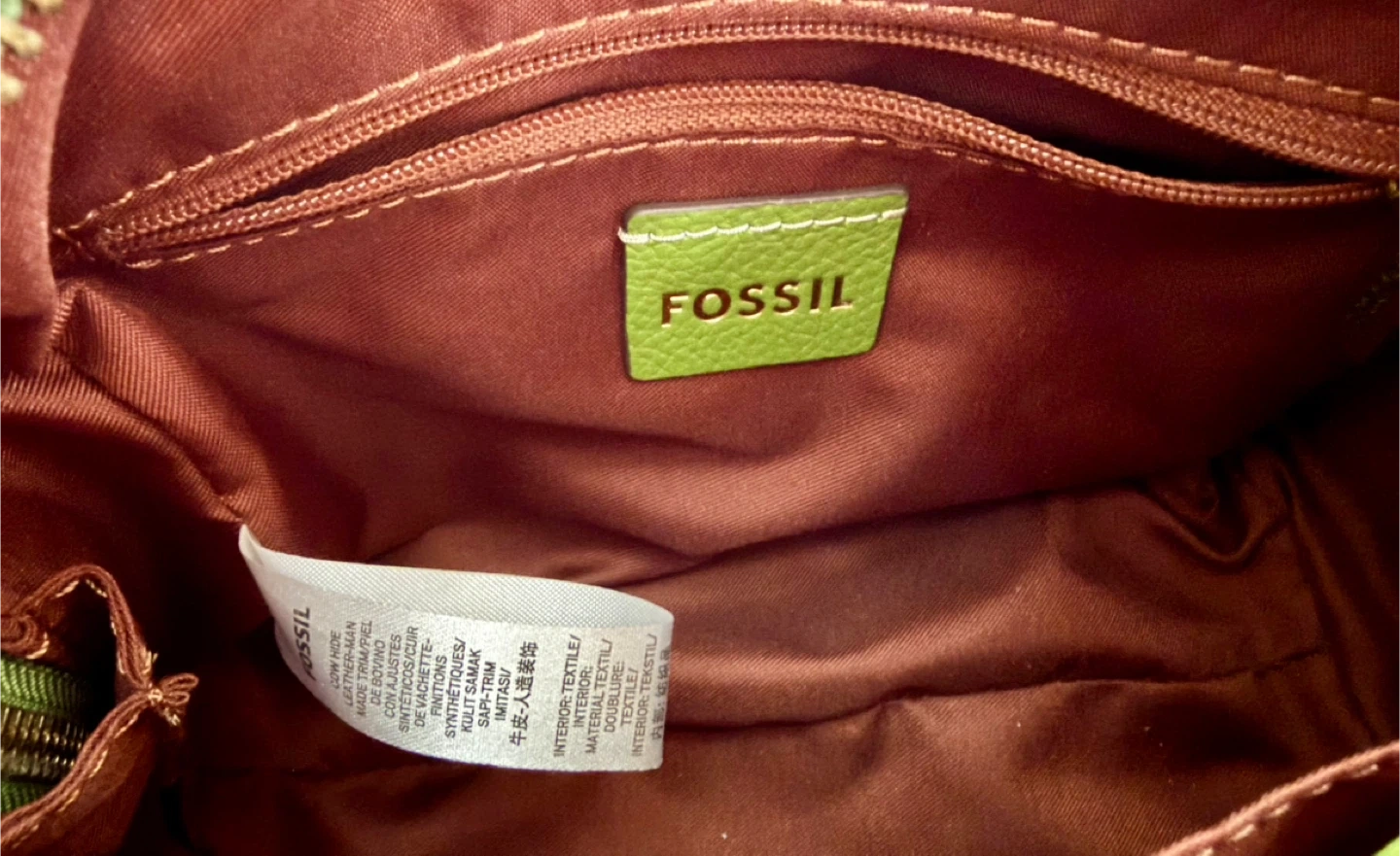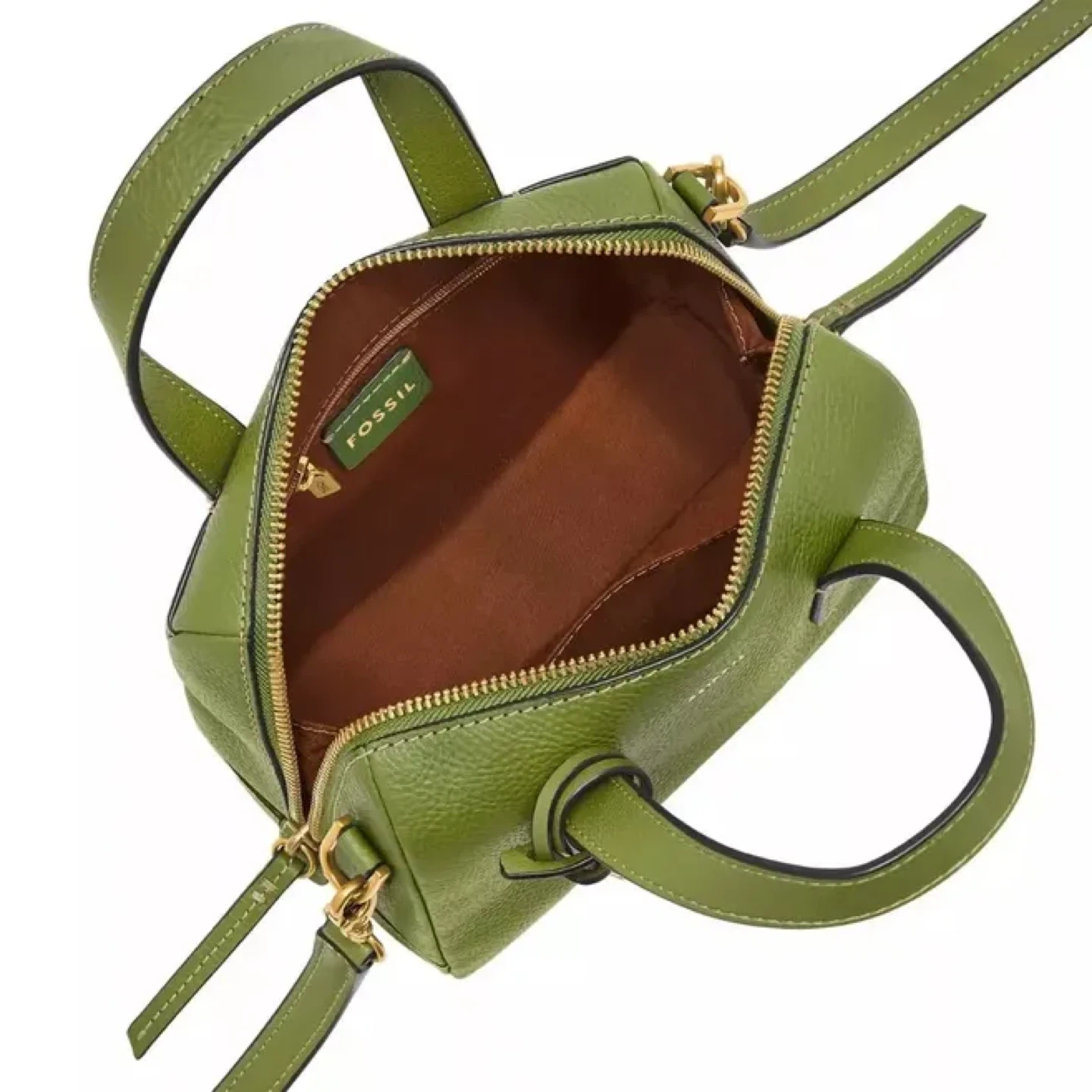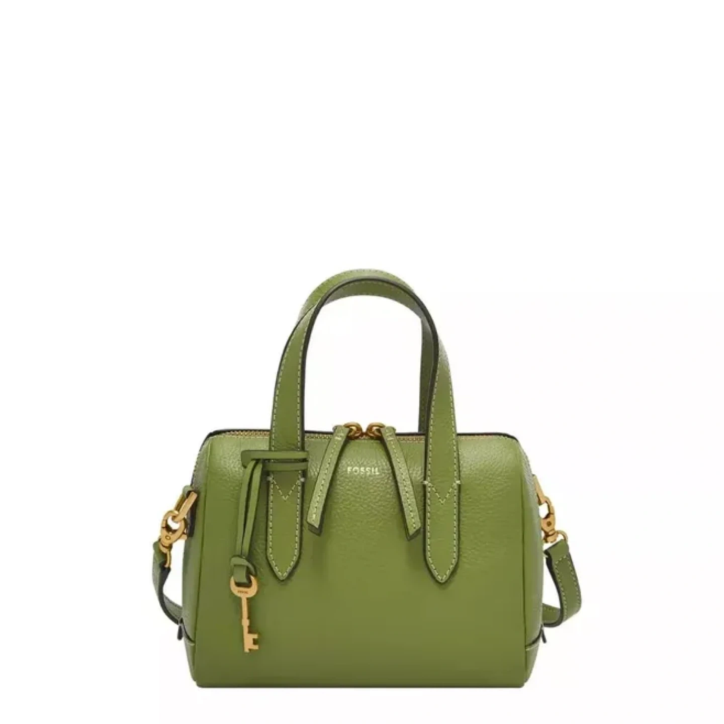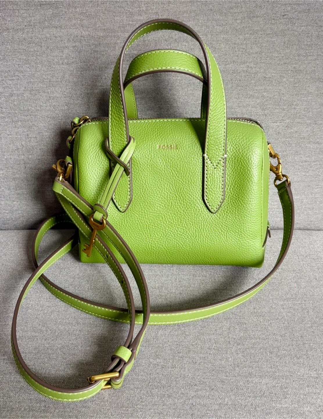 This is a lime green leather satchel purse by Fossil. It features a top zip closure and a detachable crossbody strap. It's a compact size, perfect for everyday essentials!