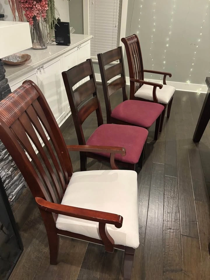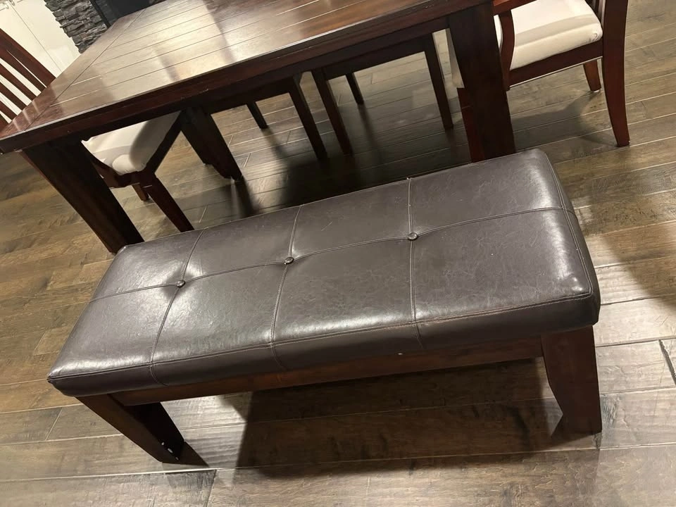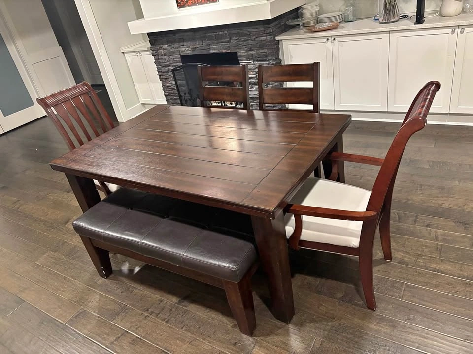 Dining table with 4 chairs and bench. All in great quality, one of the chairs a bit wobbly. Moving so need sold asap. Cash and pickup only please. Length 63”, Width 40”, Height 30”. I won’t be able to take it apart/disassemble so please make sure you have a vehicle big enough to take it.