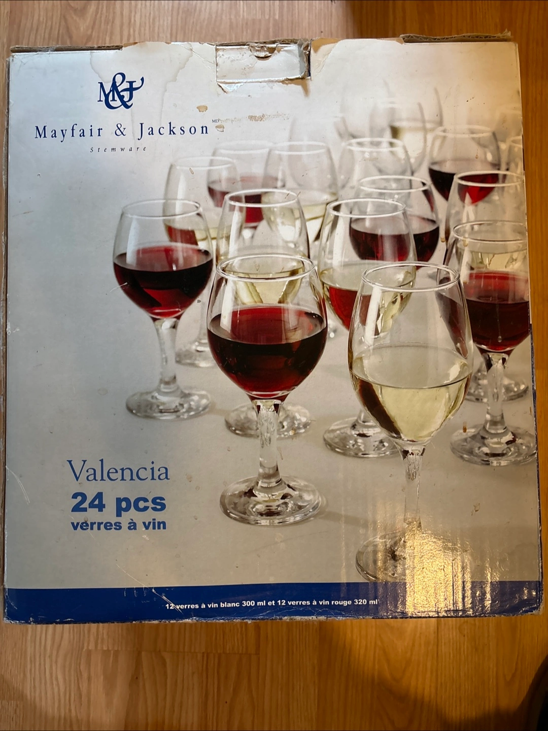 Set of 22 Valencia wine glasses. Includes 11 white wine glasses and 11 red wine glasses. Great for summer entertaining.